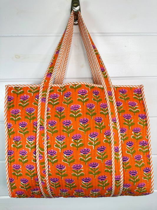 Quilted Tote Bag | Orange Floral Bag | Large Shopping Tote