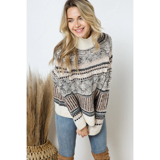 Aztec Pattern Multi Stripe Mock Neck Pullover Sweater