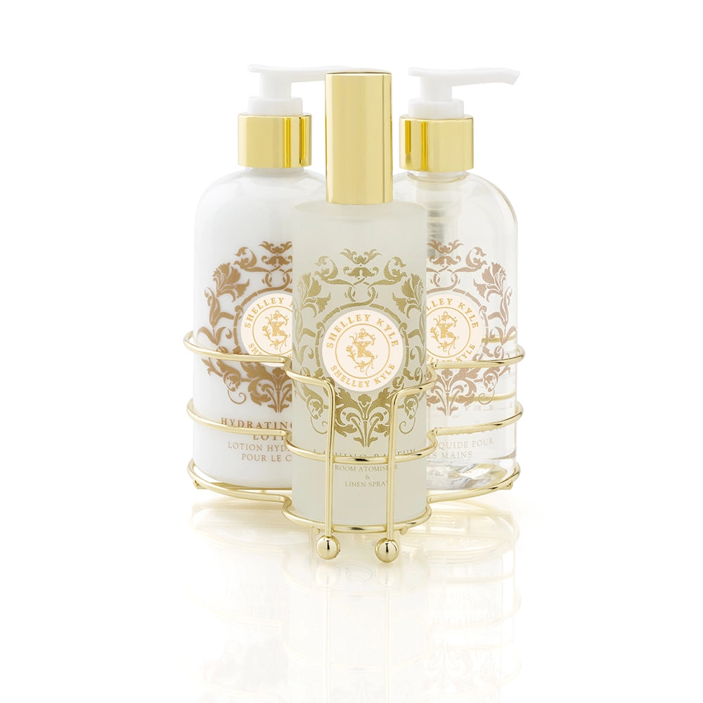 Shelley Kyle Signature Three piece Caddy with 8oz Lotion, Liquid Hand Soap and Room Atomizer.
