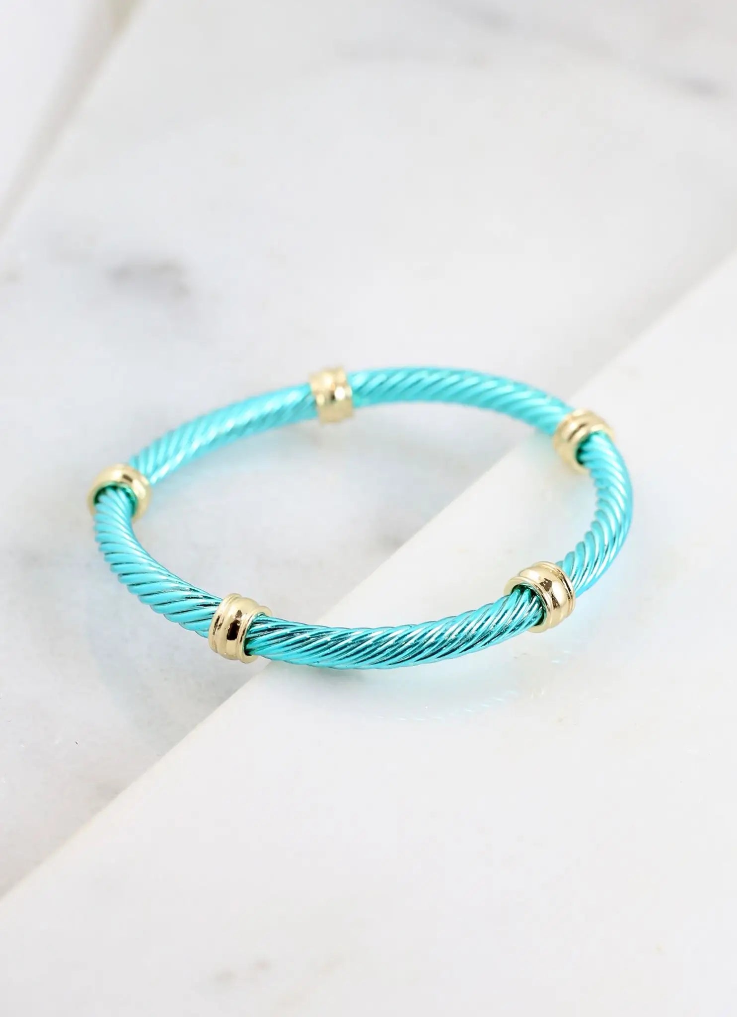 This classic turquoise cable bracelet has gold accent spacers. Unlike regular cable cuff bracelets, this style stretches to fit most wrists. Beautiful to wear alone or in a stack with other pieces.