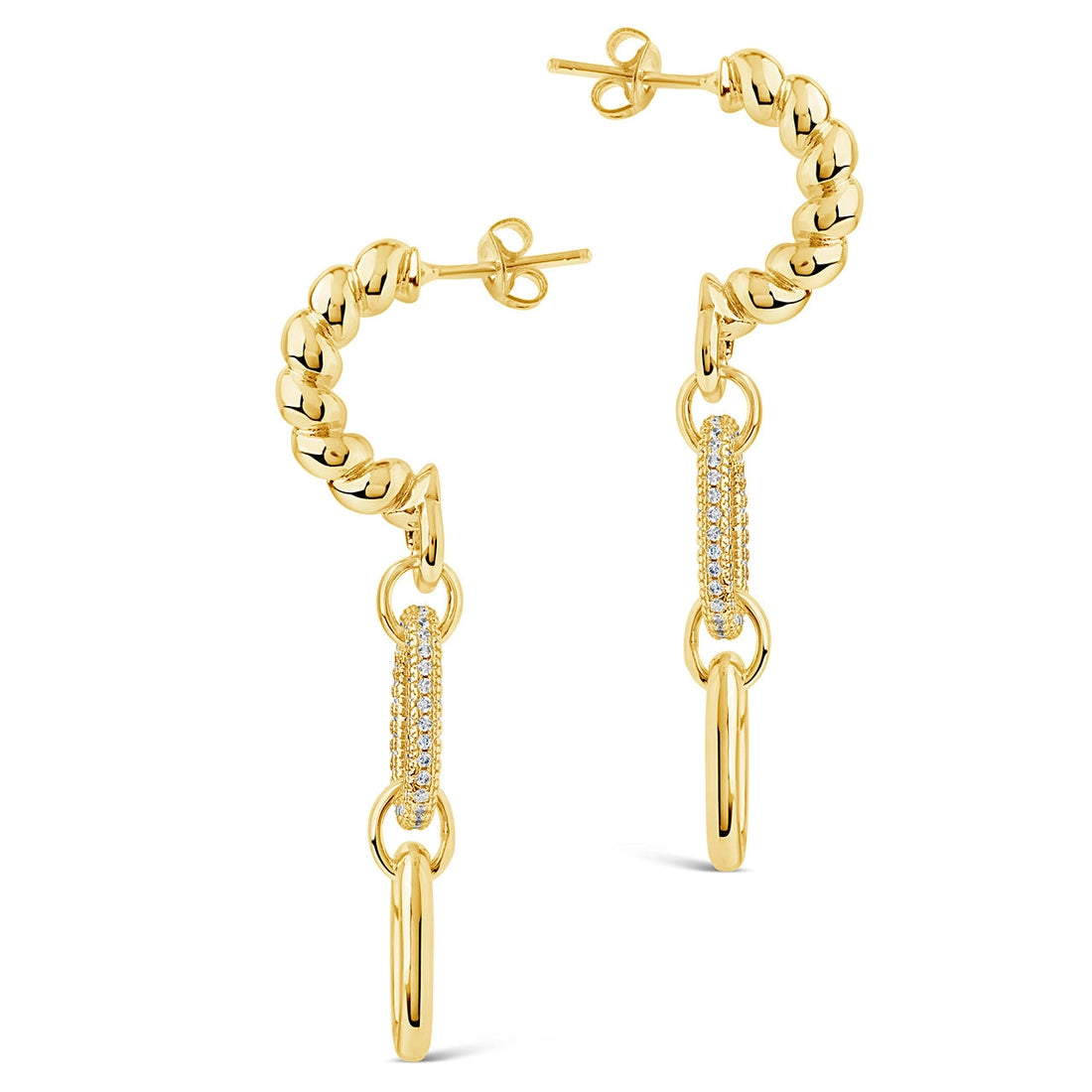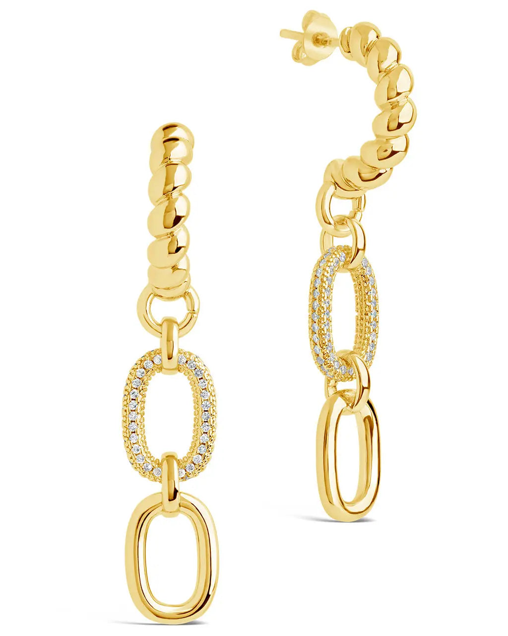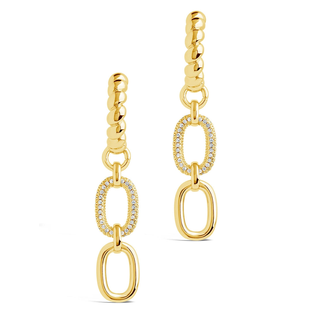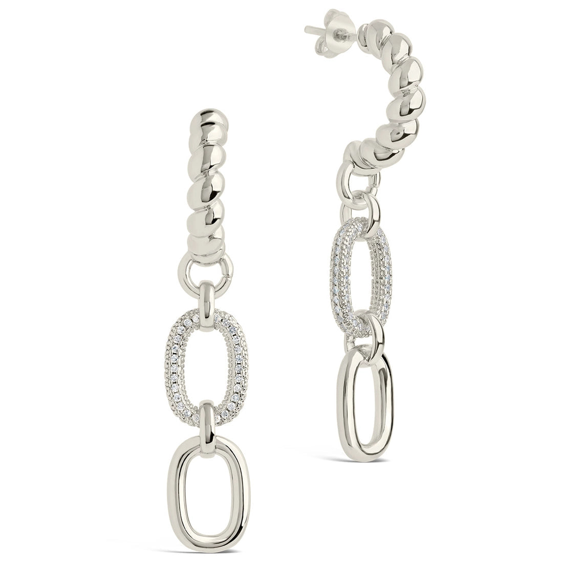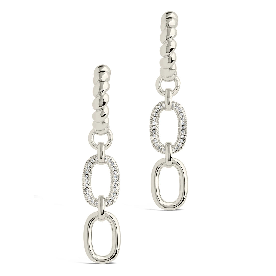 Mixed textures and sparkling CZ stones make these drop hoops a truly unique and striking choice for any fashionista! They feature a pair of dangling links and fasten securely with a post back. Available in gold and silver tones.
