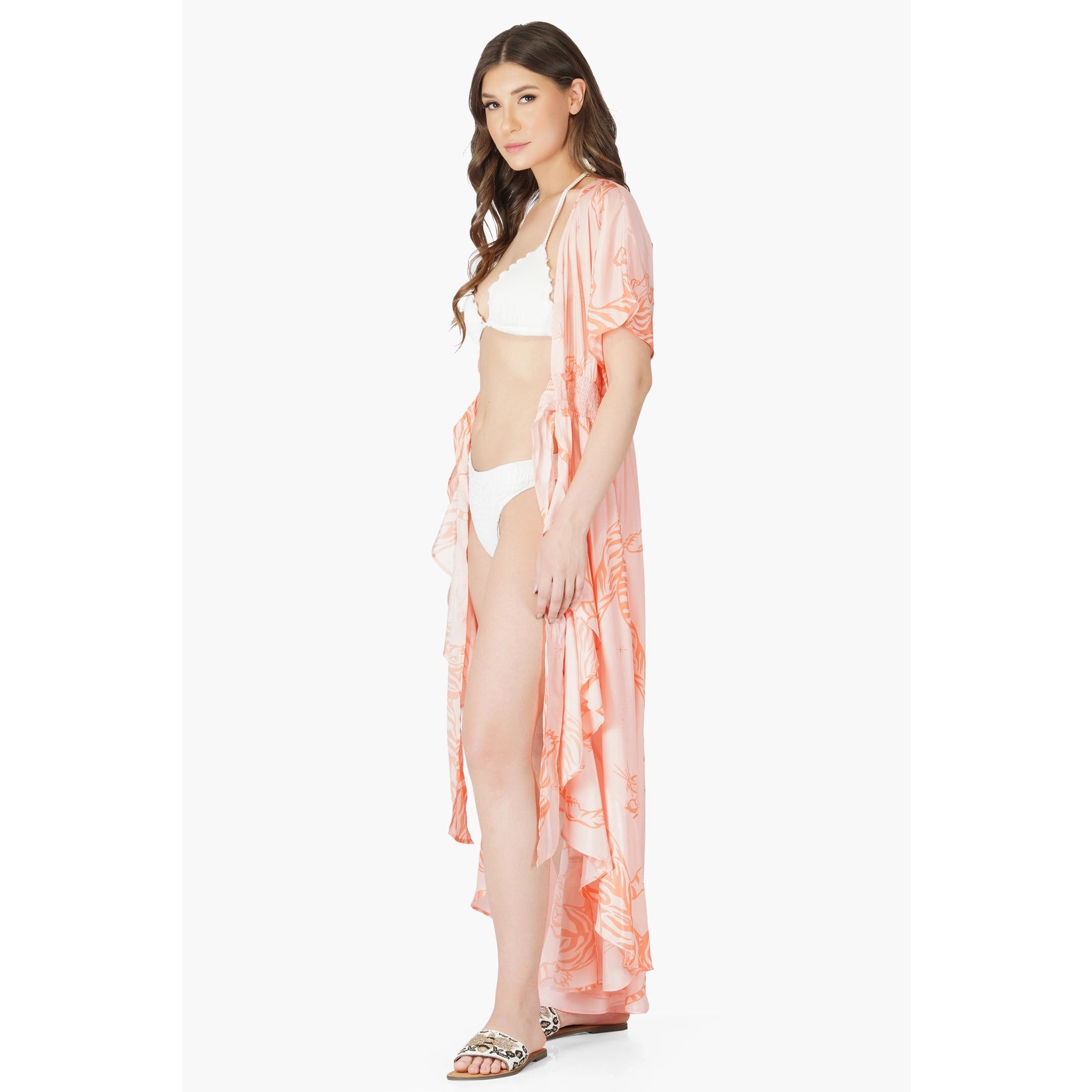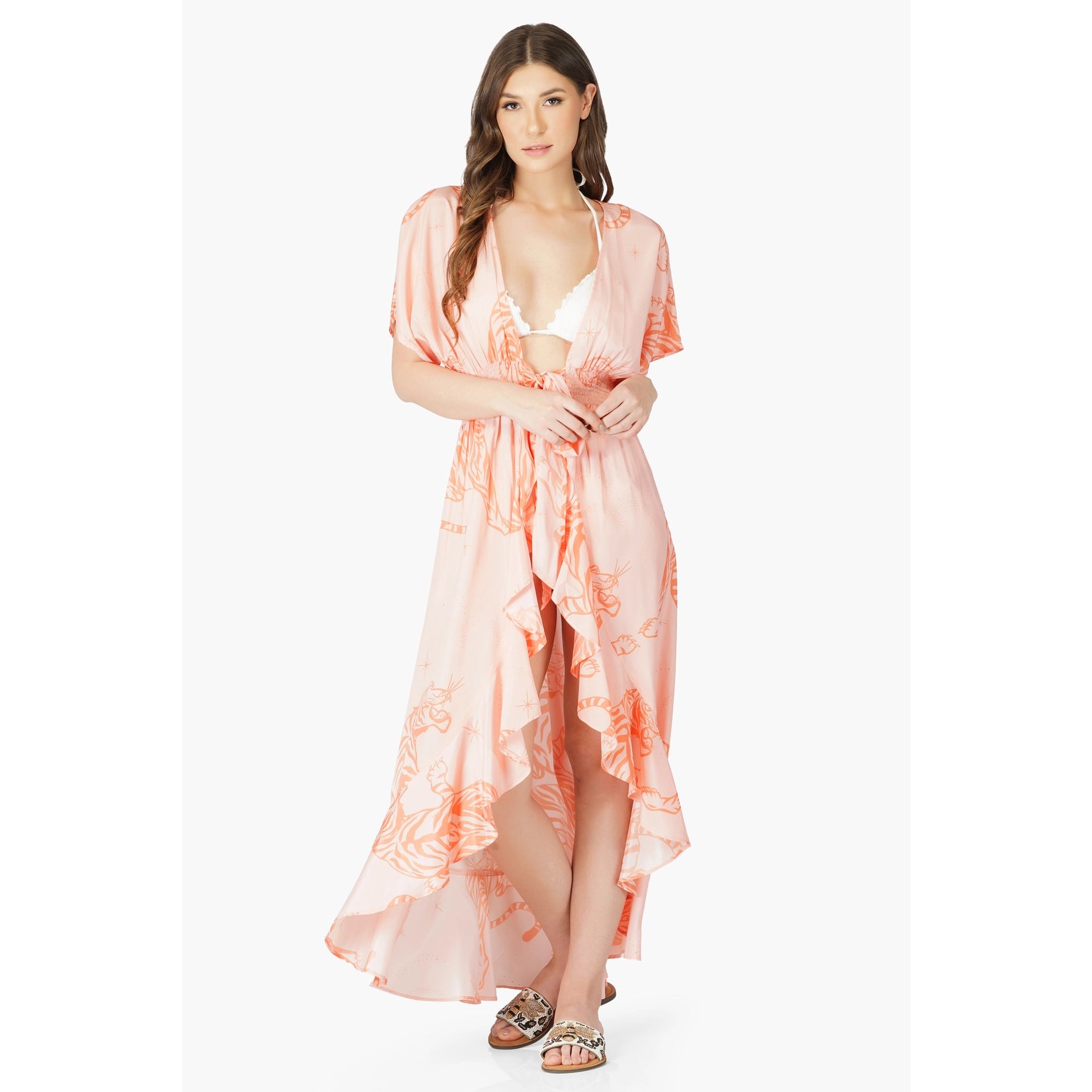 Tiger Printed Cover Up Short Sleeves Self-fabric Belt Elasticated Waist Hi-low Ruffled Hemline Made in Silk Blend