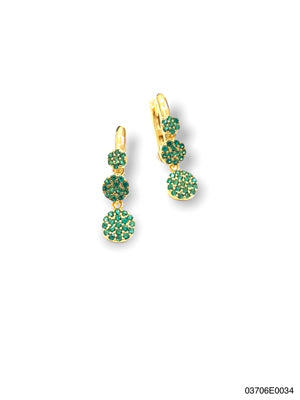 Belle petite hoop earrings accented with three hanging discs in hand set high quality CZ, Gold finish, Emerald
