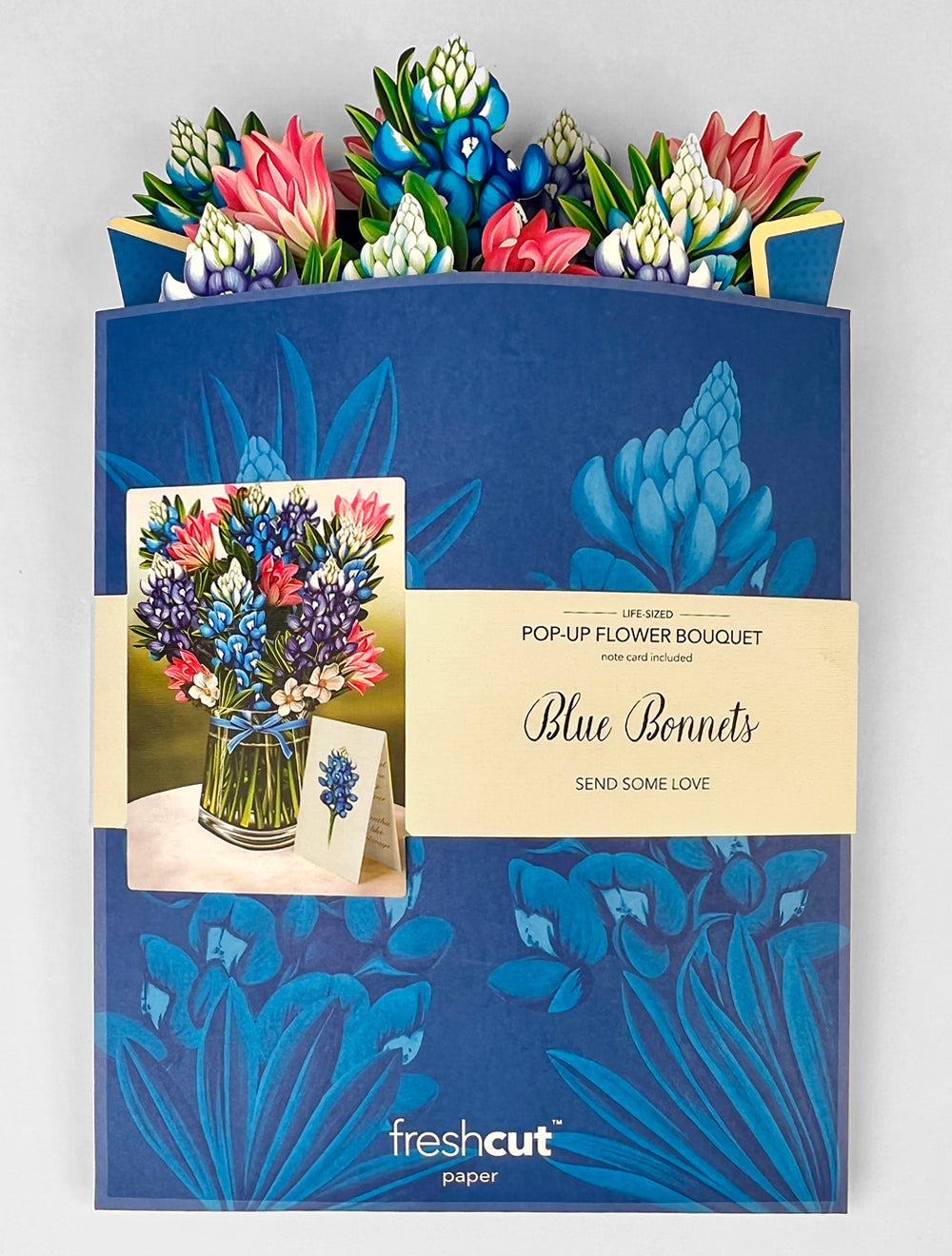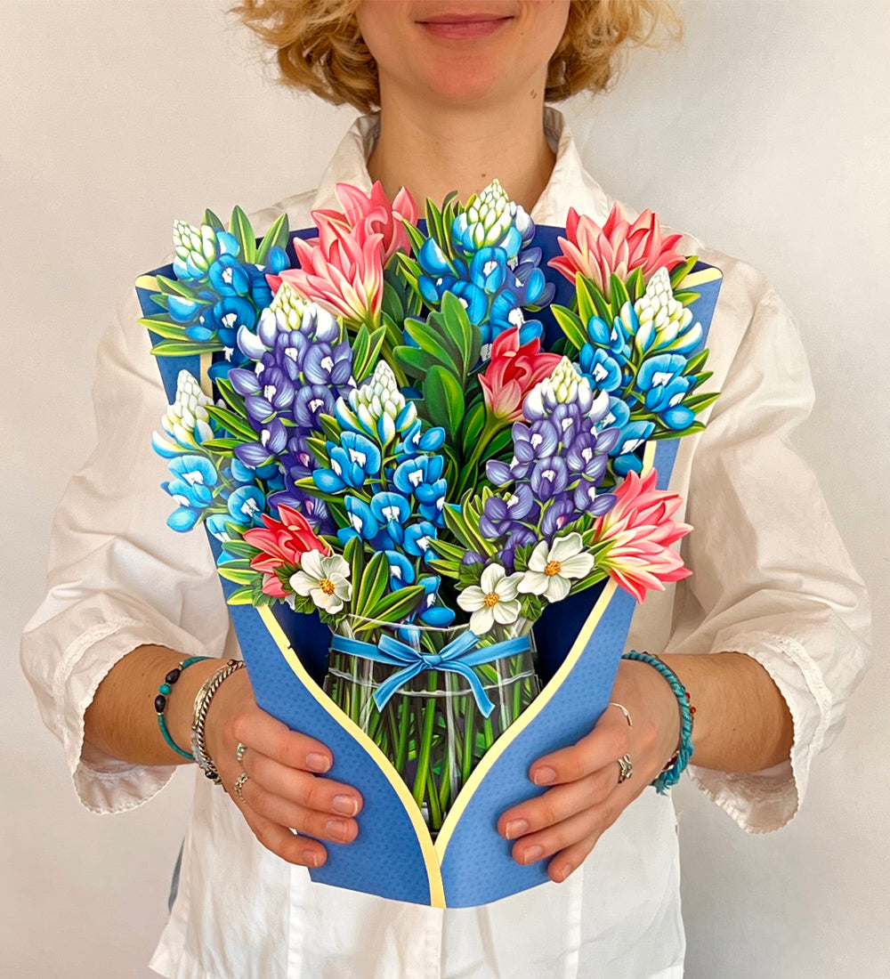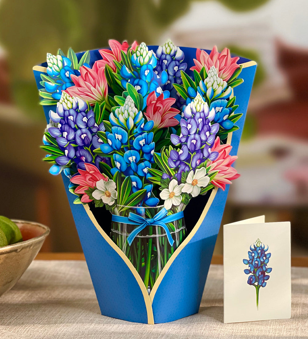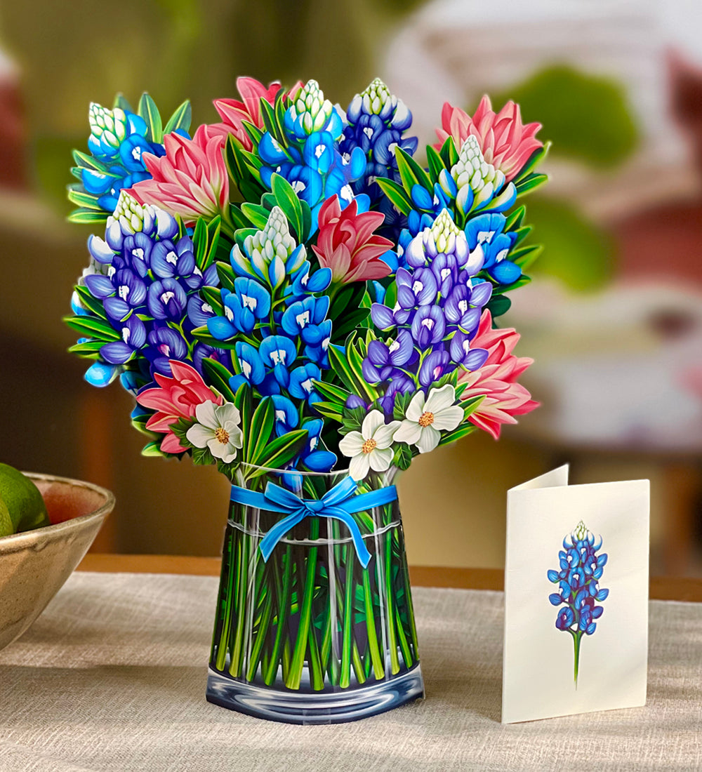 Blue Bonnets, each pop up flower card includes a small blank coordinating notecard. Each case includes a display sample. These mail anywhere in the US with just 4 Forever stamps.