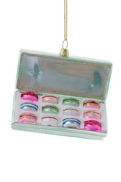Blue Box of Macarons Ornament, Hand-painted Glass, Glitter detailing, 4"