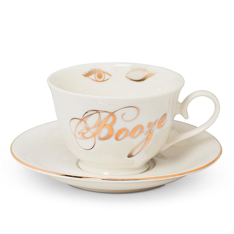 Add some sinful sophistication to your morning cup of tea with this unexpected Booze Cup & Saucer. Designed by Abbott, this Bone China saucer and teacup are accented with stylish 10K gold details, from "Booze" written in stylish cursive on the teacup to the illustrated eyes on its inner lip, as well as accenting the saucer's outer rim. Hand wash only; not microwave-safe. Other Saucy Teacup & Saucers also available.