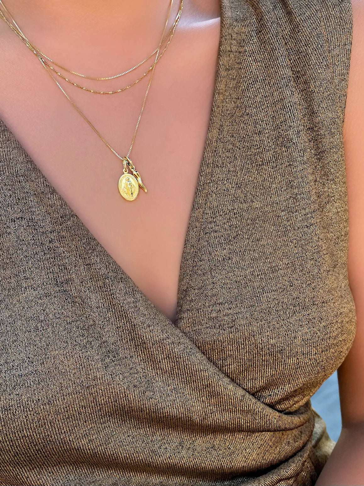 Southern Italian elegance collides with the Cosenza Necklace set. This lucky charm necklace includes a gold Madonna pendant and a small gold corno all on a Veneziana chain. Show off your Italian style and live the la dolce vita life with The Cosenza Necklace.