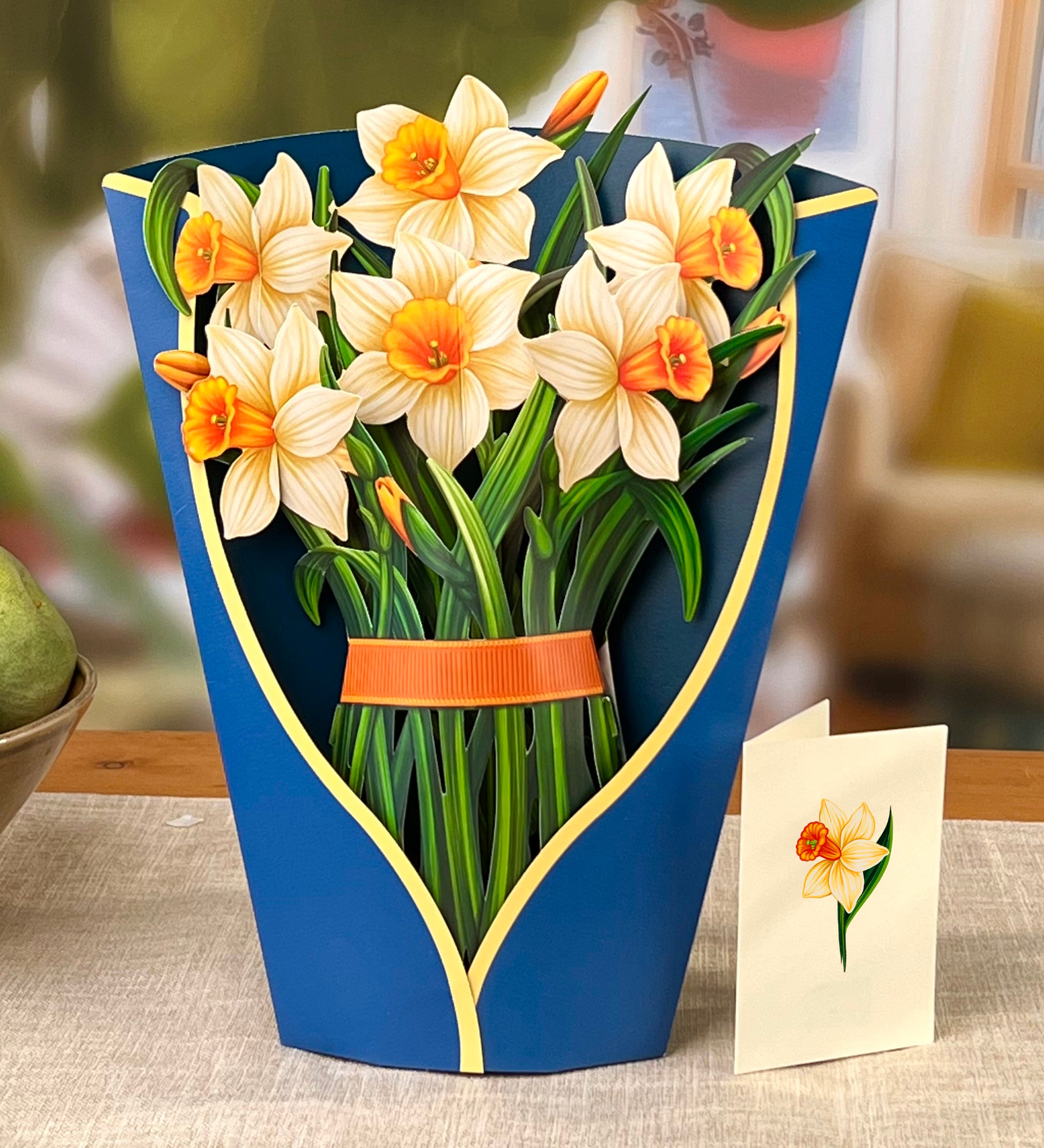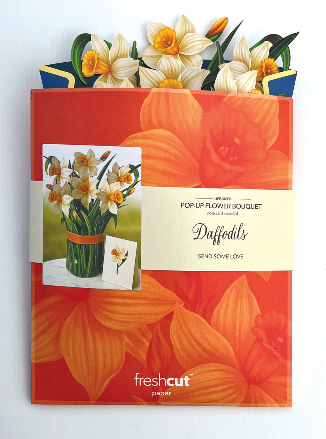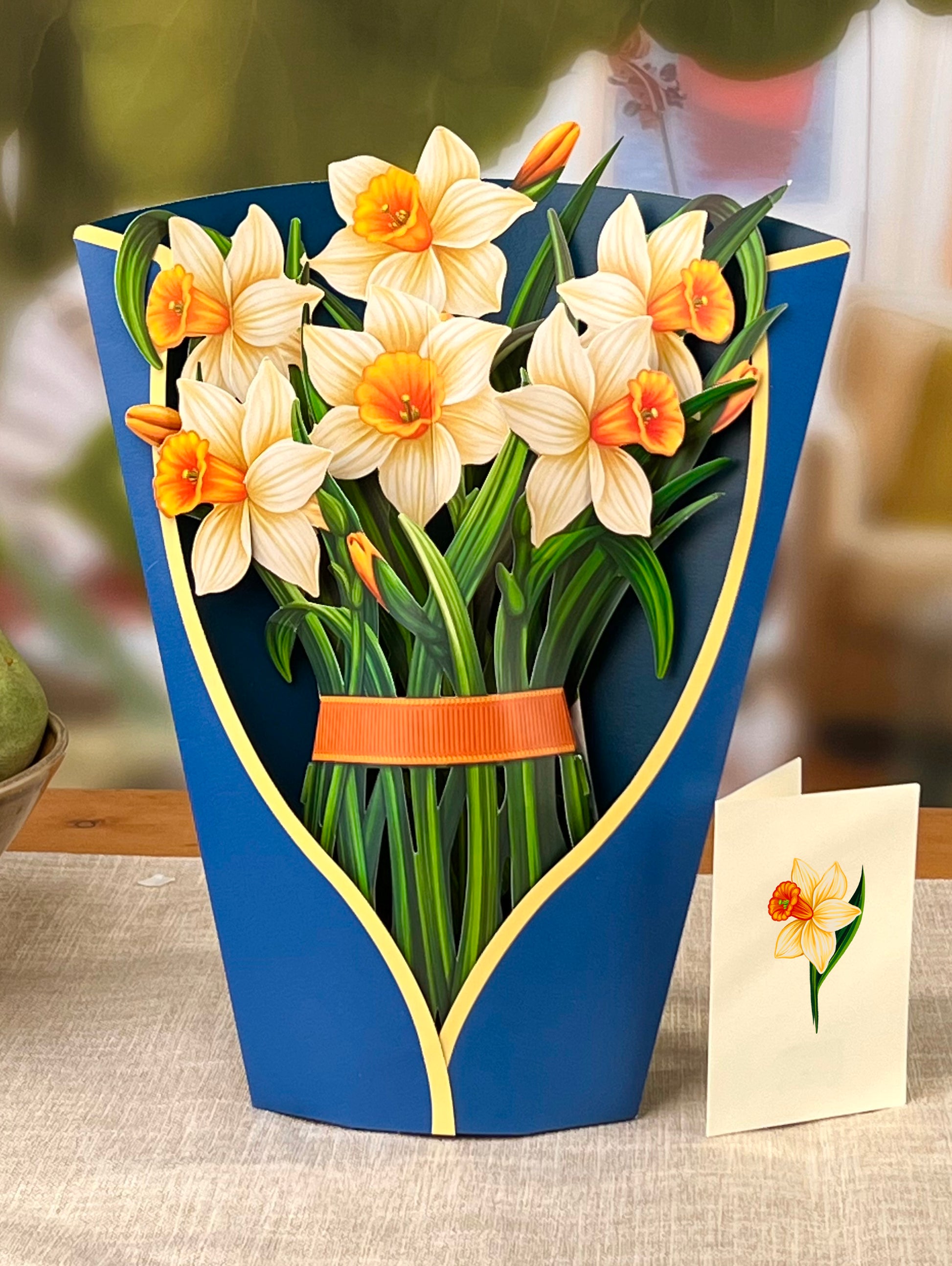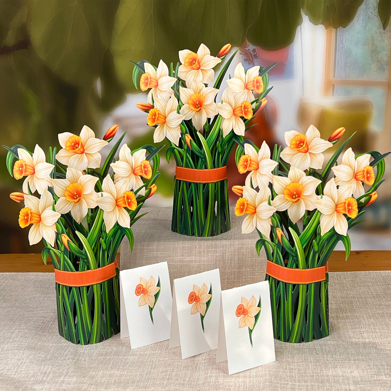 Daffodils, each pop up flower card includes a small blank coordinating notecard. Each case includes a display sample. These mail anywhere in the US with just 4 Forever stamps.