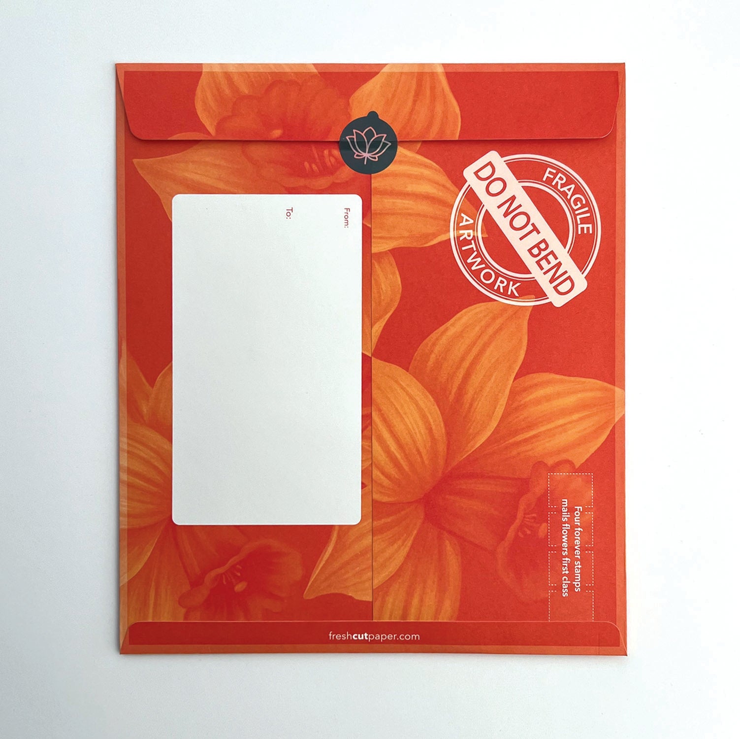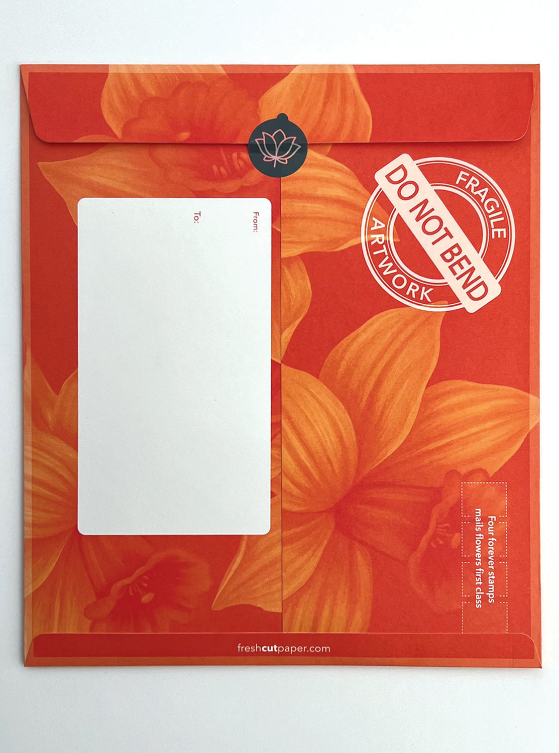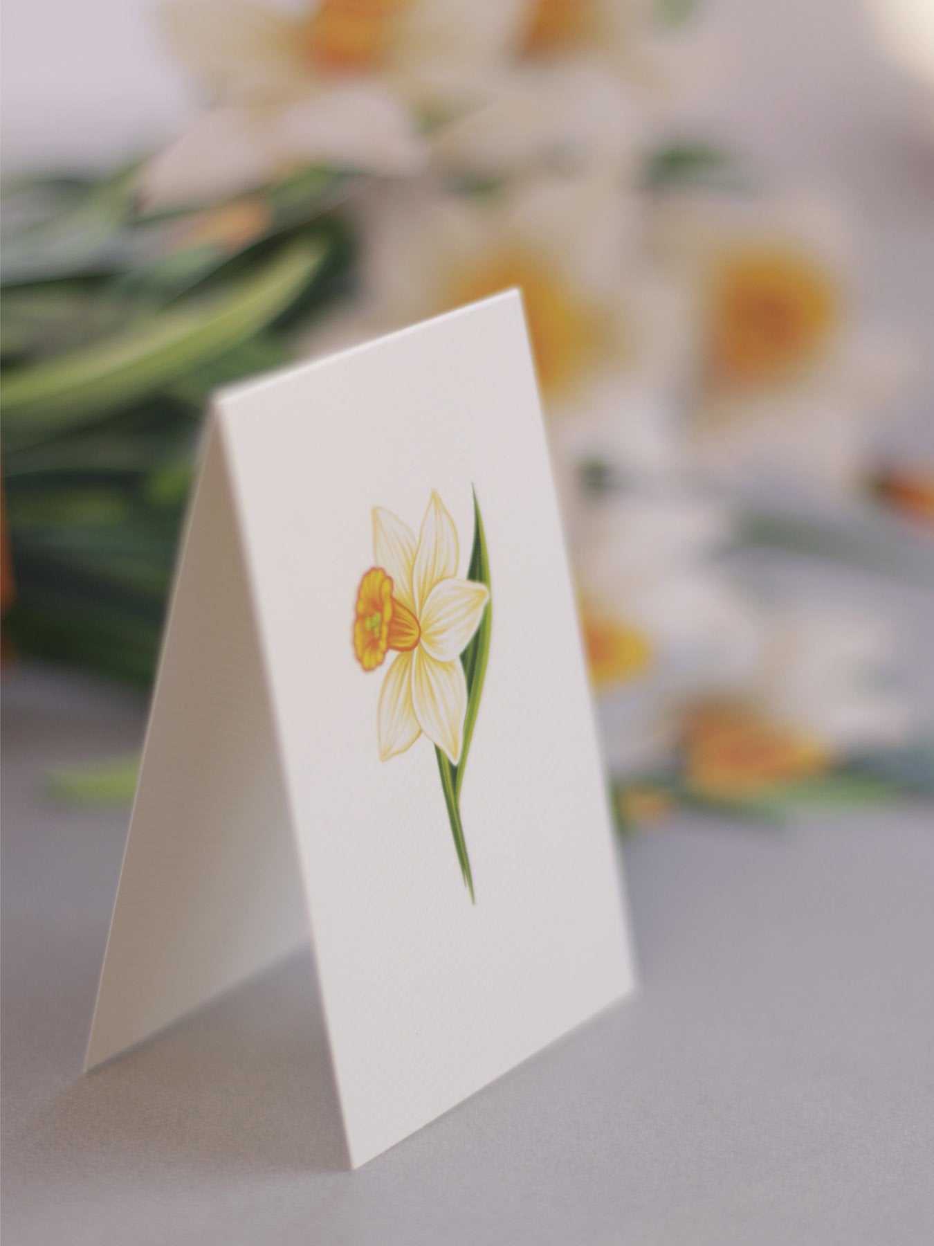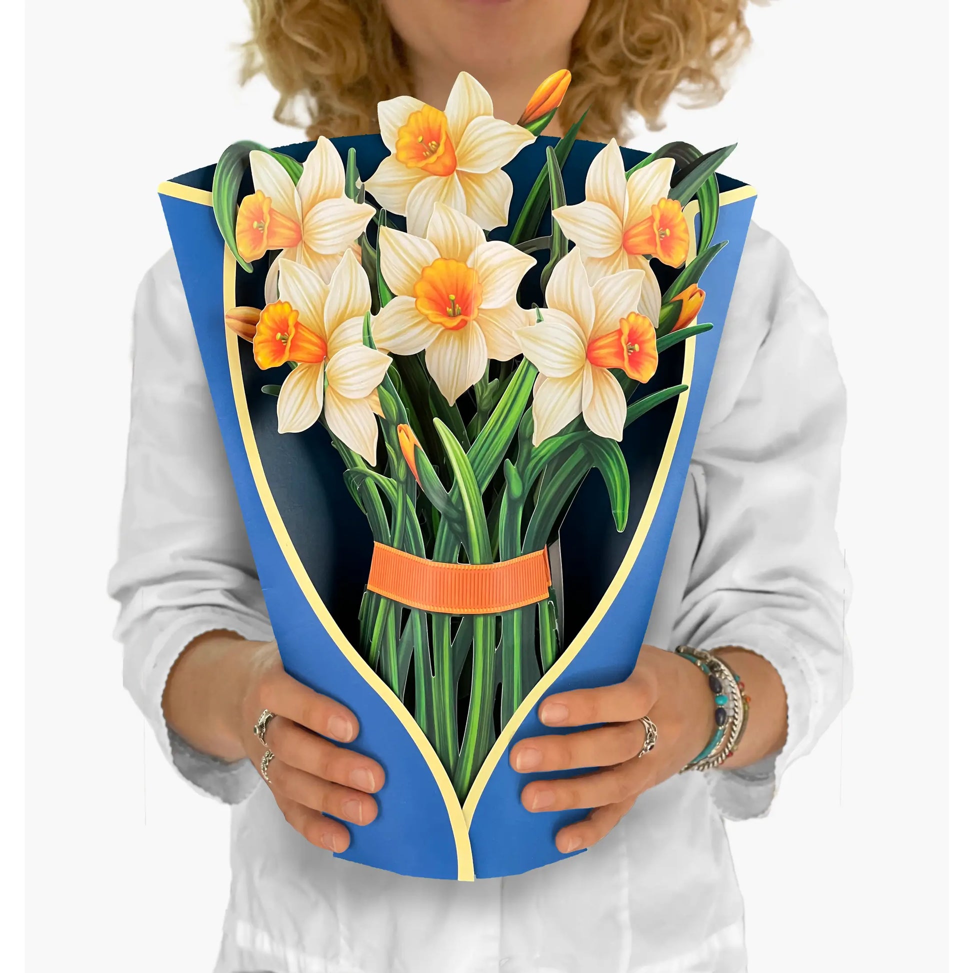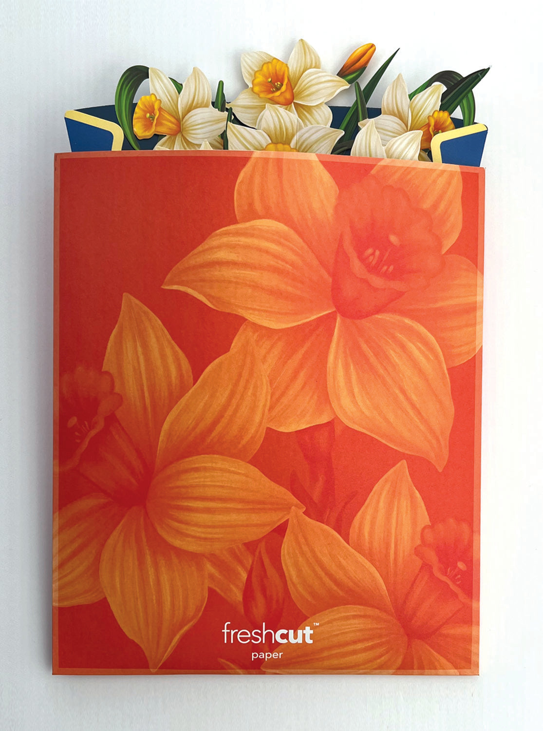 Daffodils, each pop up flower card includes a small blank coordinating notecard. Each case includes a display sample. These mail anywhere in the US with just 4 Forever stamps.