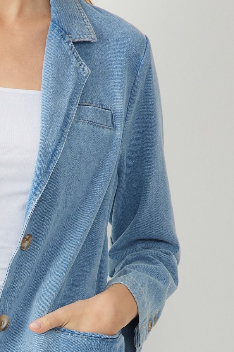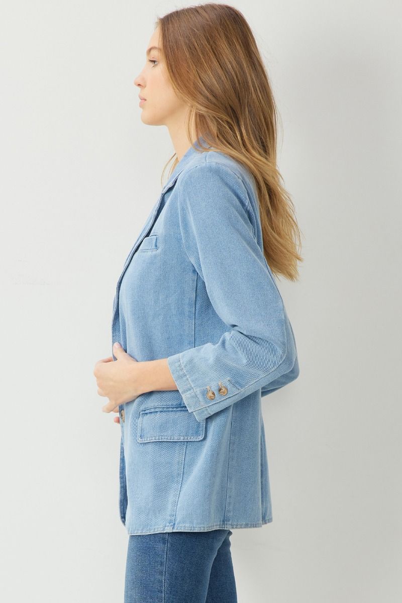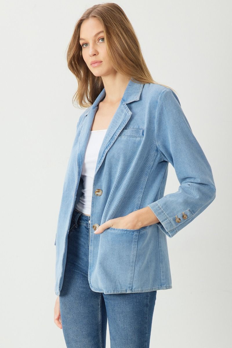 Acid wash denim button front blazer featuring pockets at bust and side. Button closure at sleeves. Unlined. Woven. Non-sheer. Mediumweight.