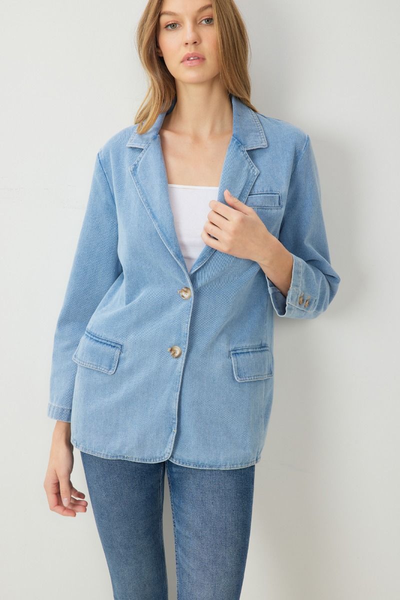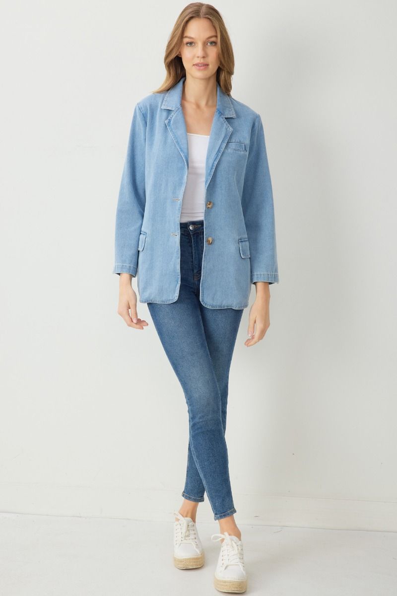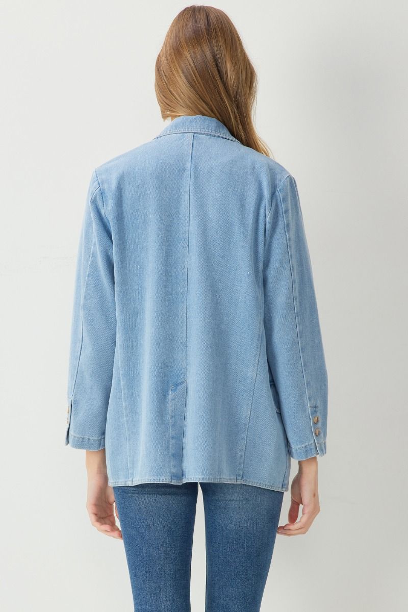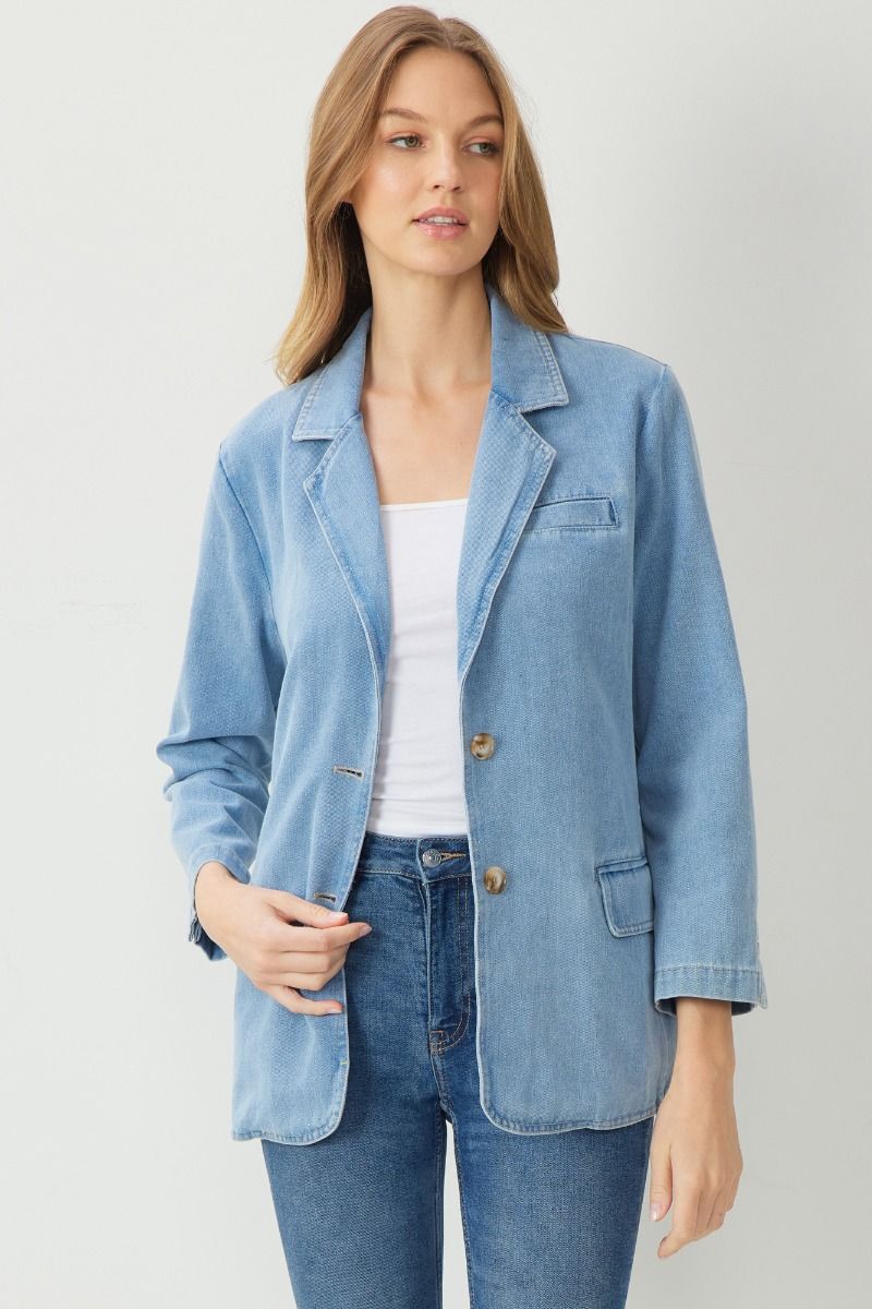 Acid wash denim button front blazer featuring pockets at bust and side. Button closure at sleeves. Unlined. Woven. Non-sheer. Mediumweight.