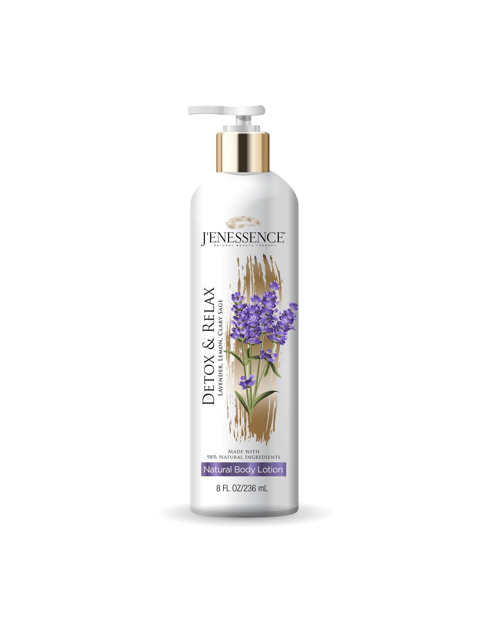 J’enessence® Detox & Relax Natural Therapeutic Body lotion is made with 98% naturally derived ingredients to help detoxify, restore natural glow, and preserve skin cells. Fortified with Lavender, Lemon and Clary Sage, this natural moisturizer will leave your skin looking healthy while boosting its resistance against daily dryness. This set was created to detoxify your skin naturally while providing an at home spa treatment and destress and relax you anytime of the day.