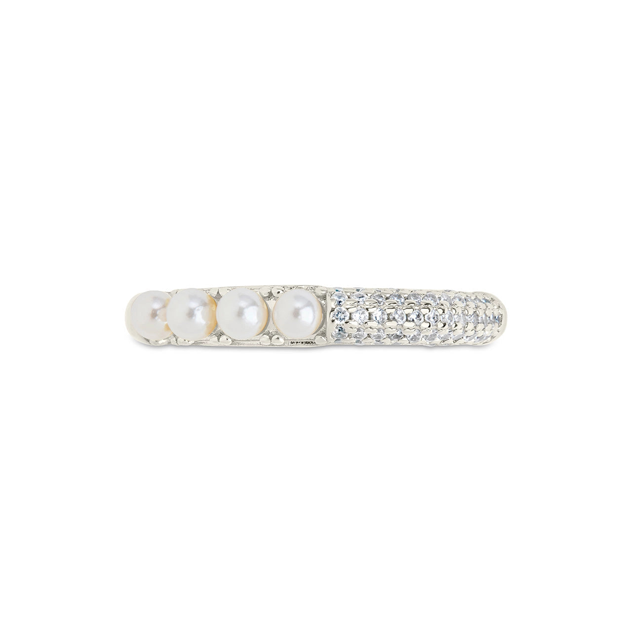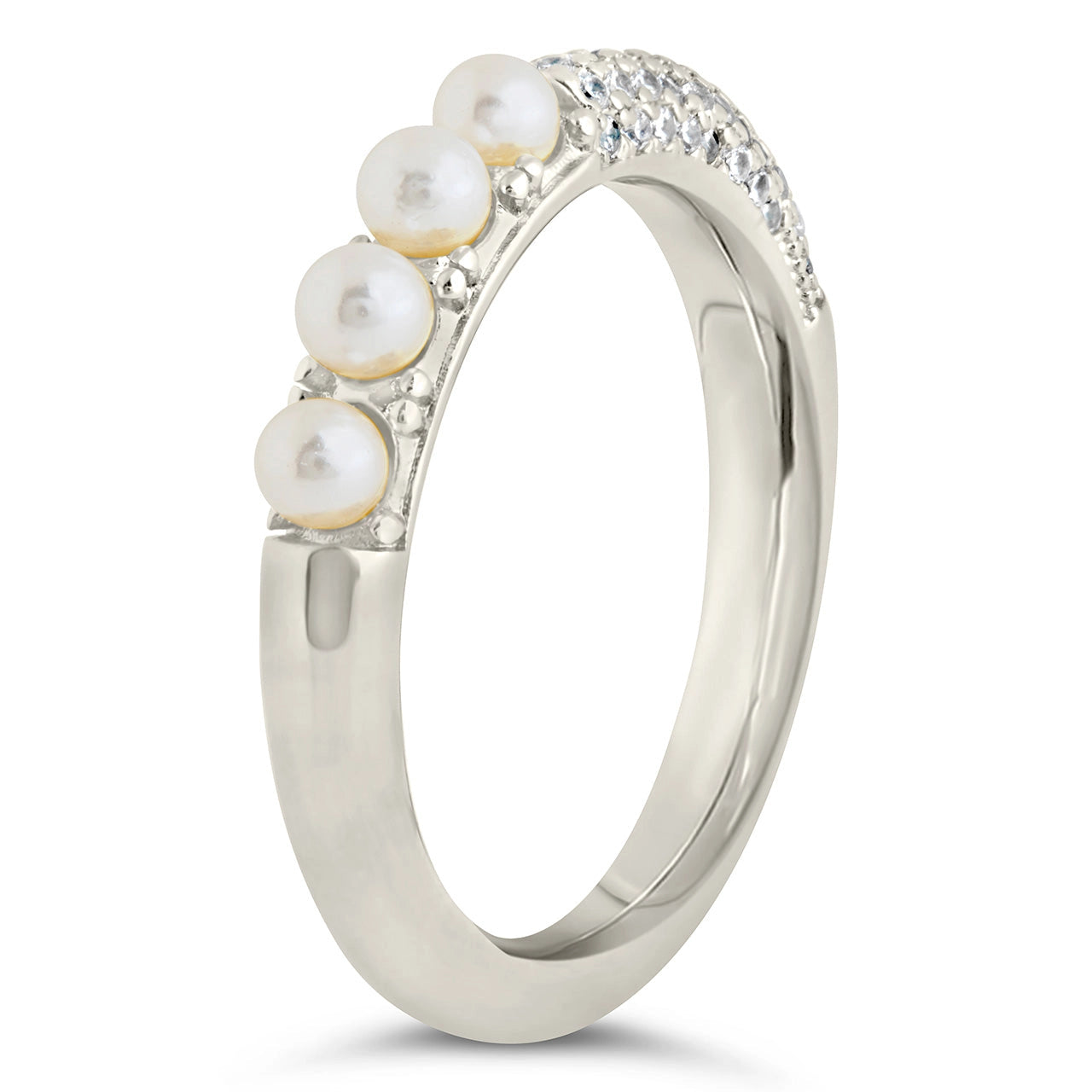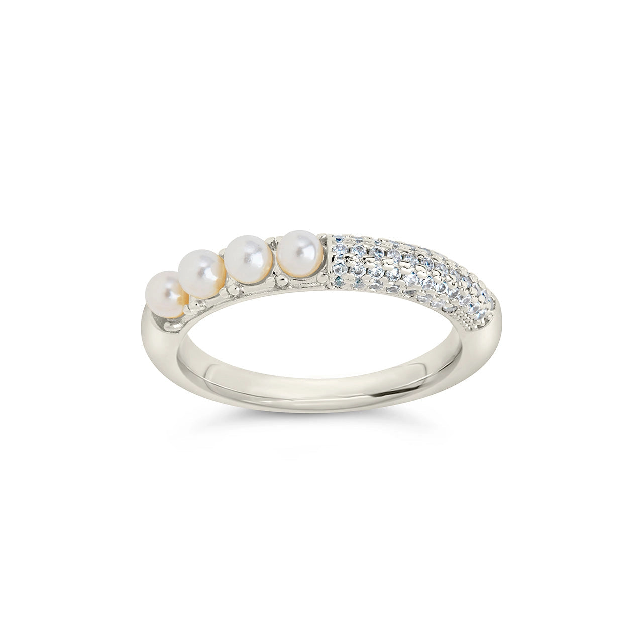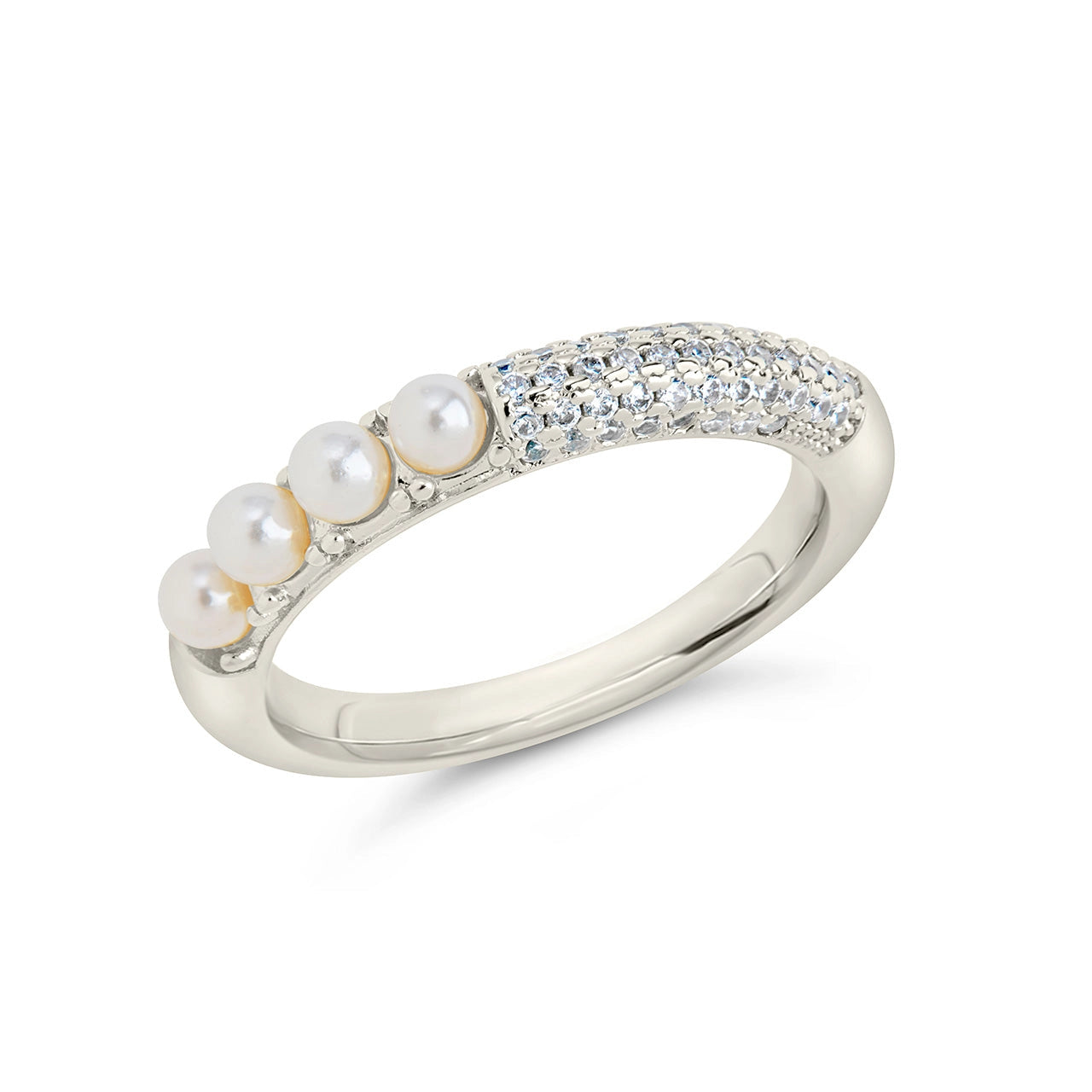 Dainty shell pearls and dazzling CZ stones make this band truly glamorous! Add some shine to your look with this ring that you'll love showing off. Available in gold and silver tones.