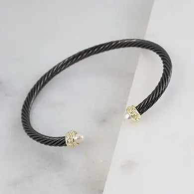 Flueger Cable Cuff Bracelet with Pearl Ends Hematite