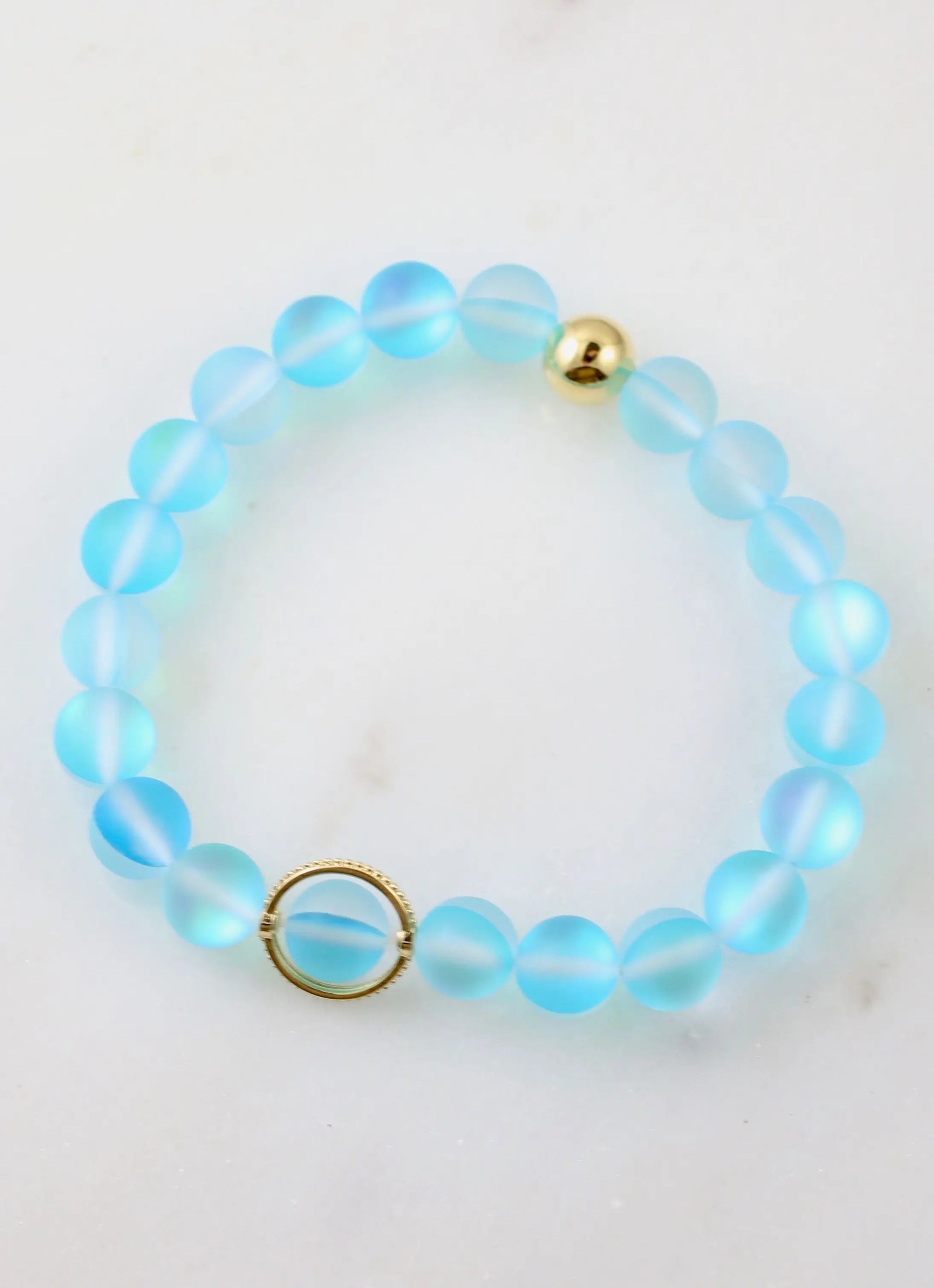 This bracelet is made with glass beads that have an opal look. Stretches to fit most wrists.