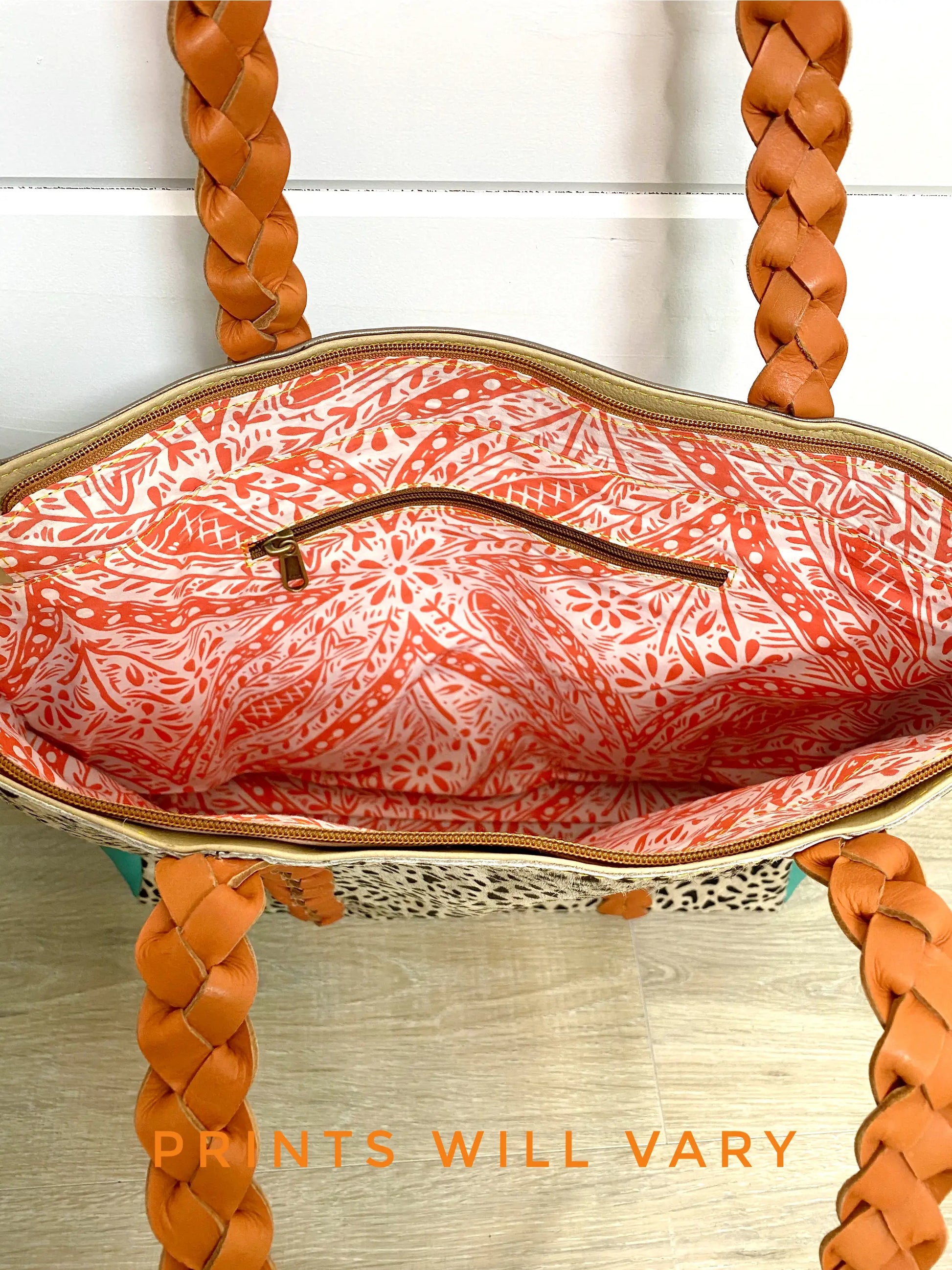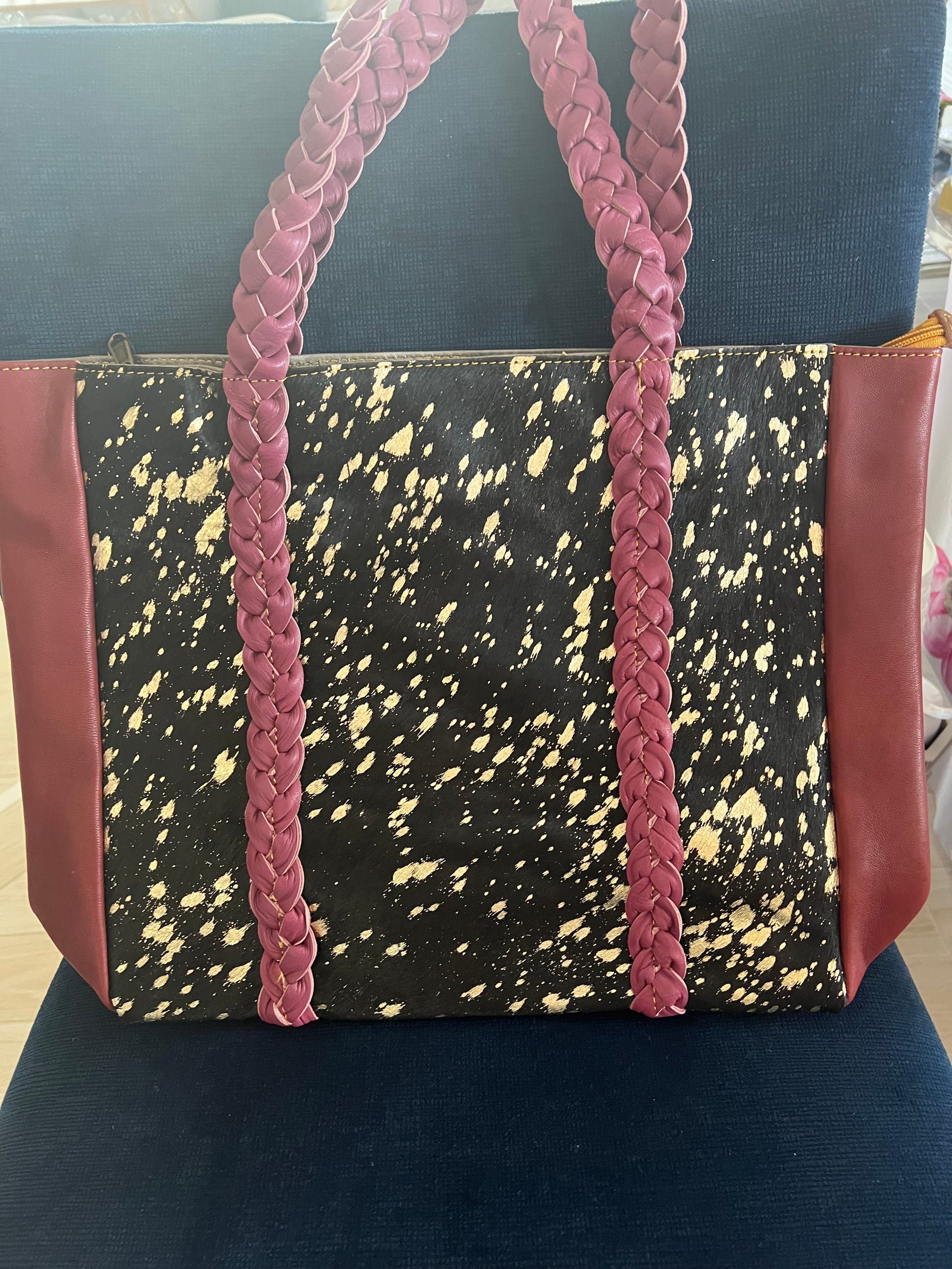 Genuine leather bag featuring braided handles and hair on hide. Handmade in India.
