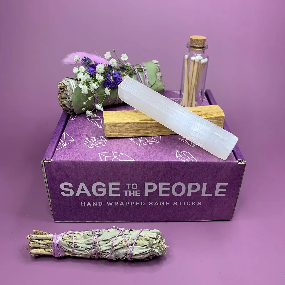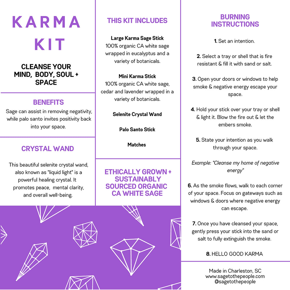 Our Karma Kit was designed to create balance in your life. The Sage in the kit is intended to clear the negativity and the Palo Santo is intended to welcome in positivity. Each kit comes with a large karma stick (as pictured), a mini karma stick (sage wrapped in purple statice), a palo santo stick, a selenite crystal wand and a bottle of matches!