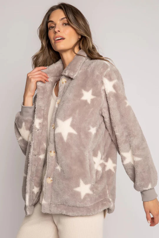 The P.J. Salvage cozy plush jacket comes with faux fur detailing. This button-front jacket boasts lower welt pockets for added style and convenience. For a complete and comfortable look, pair it with the matching shorts and/or pants.