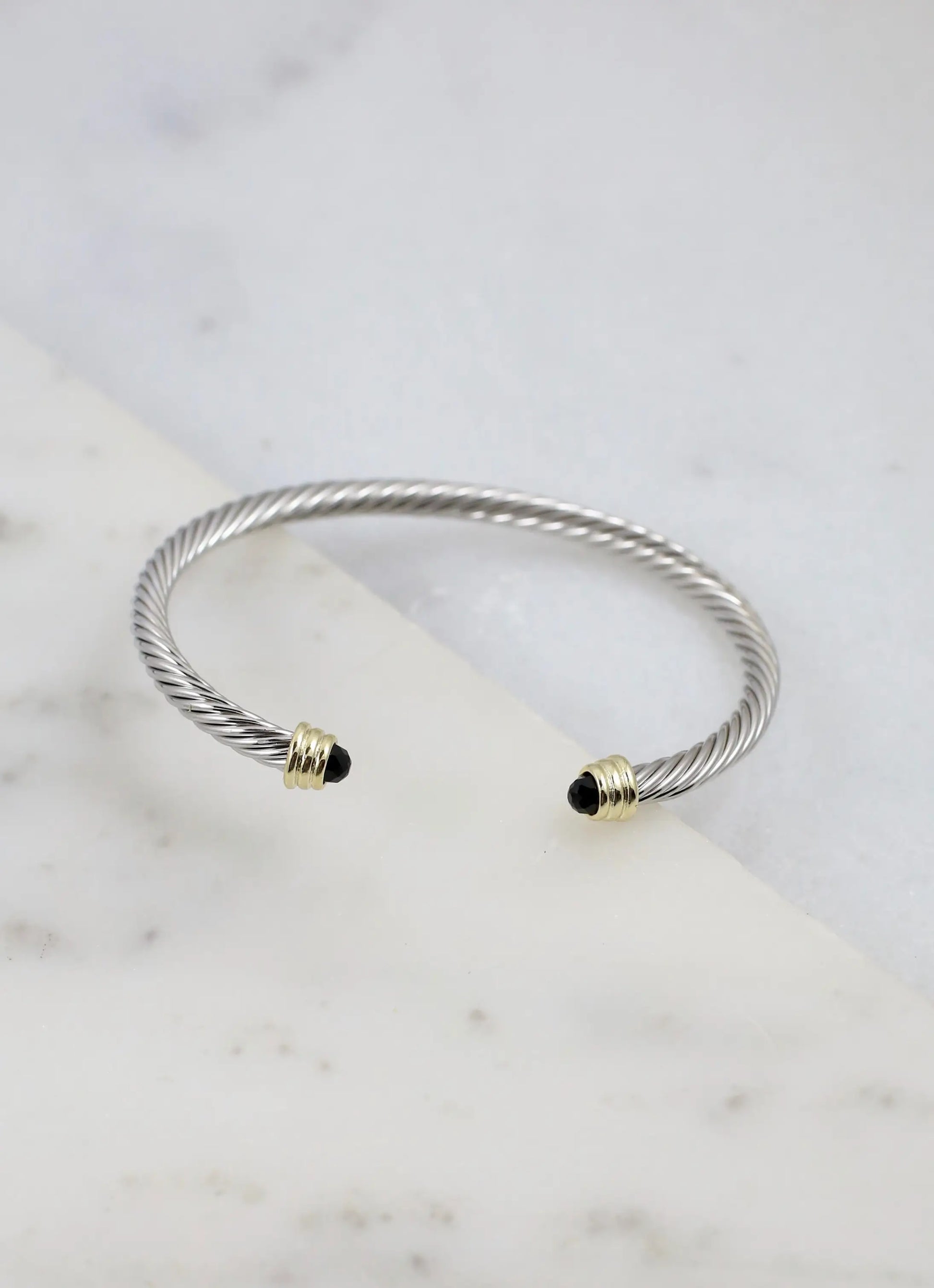 This thin cable cuff bracelet is a classic piece. It features black stone capped ends. It has a timeless look and will be great worn alone or in a stack. It is slightly adjustable.