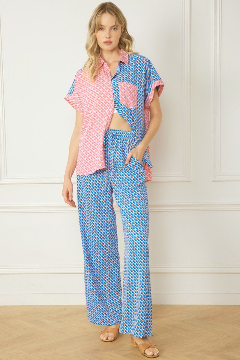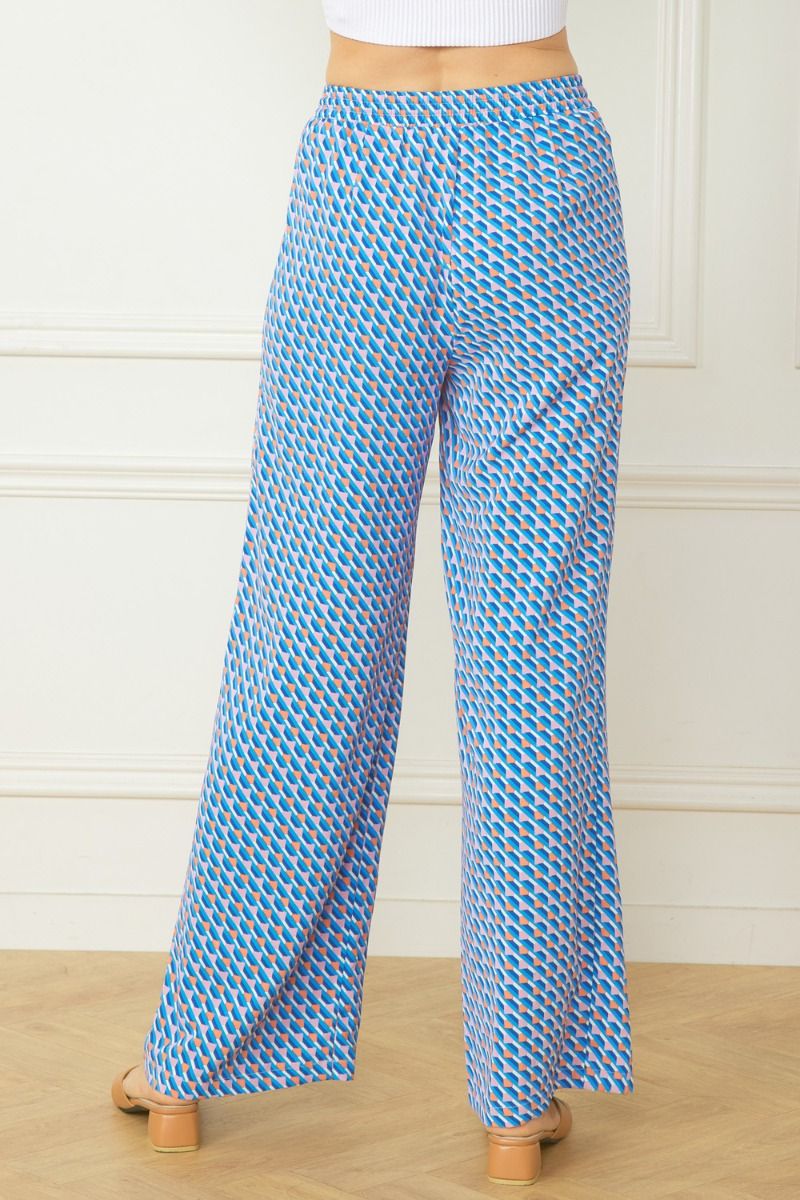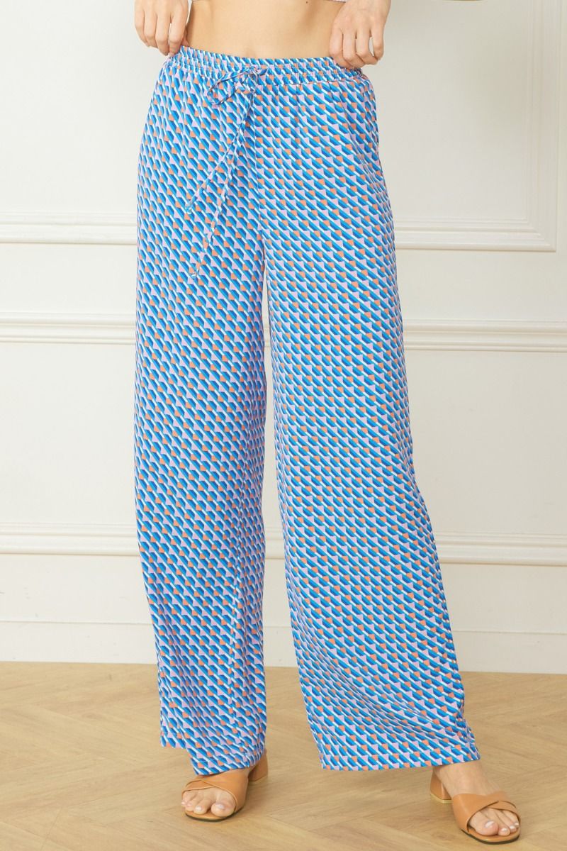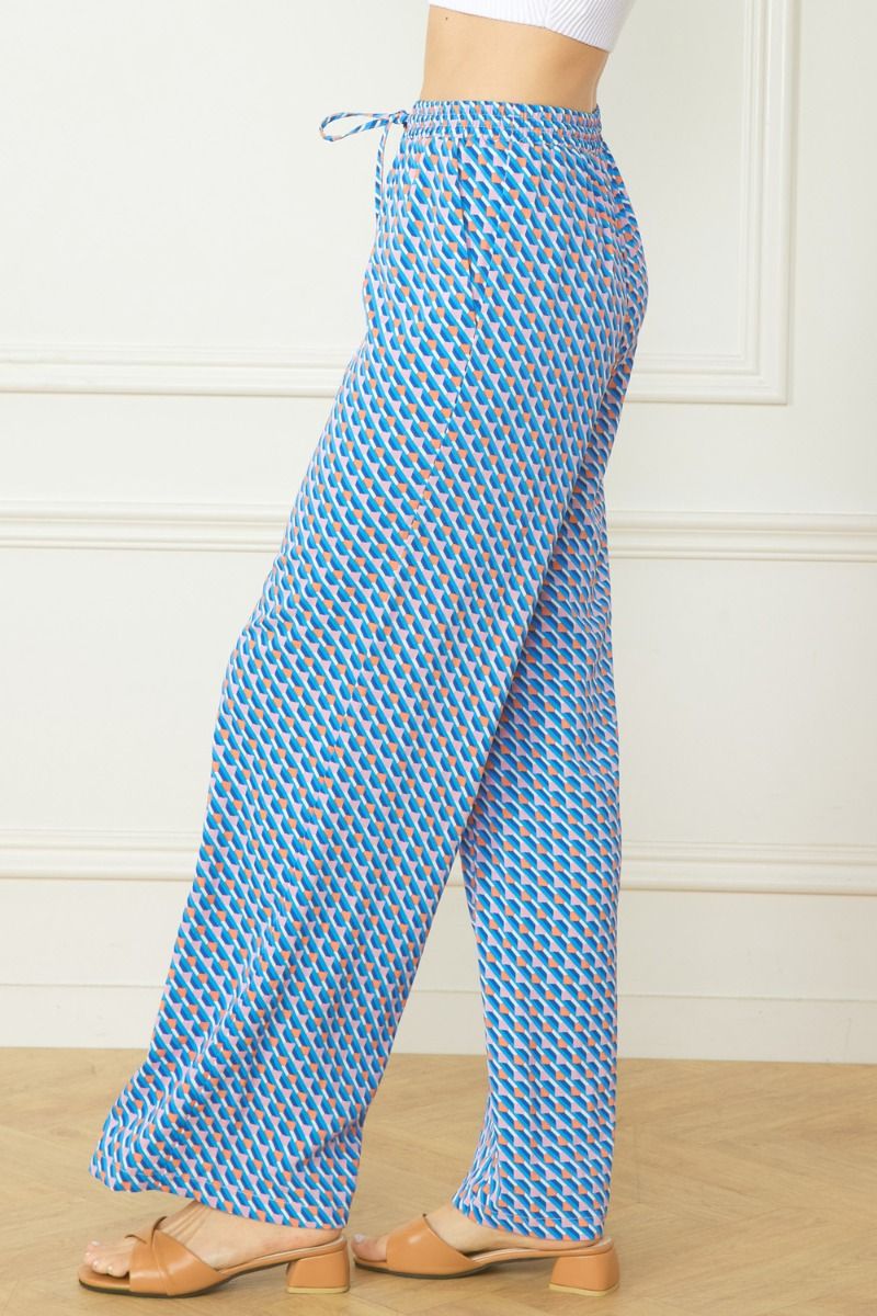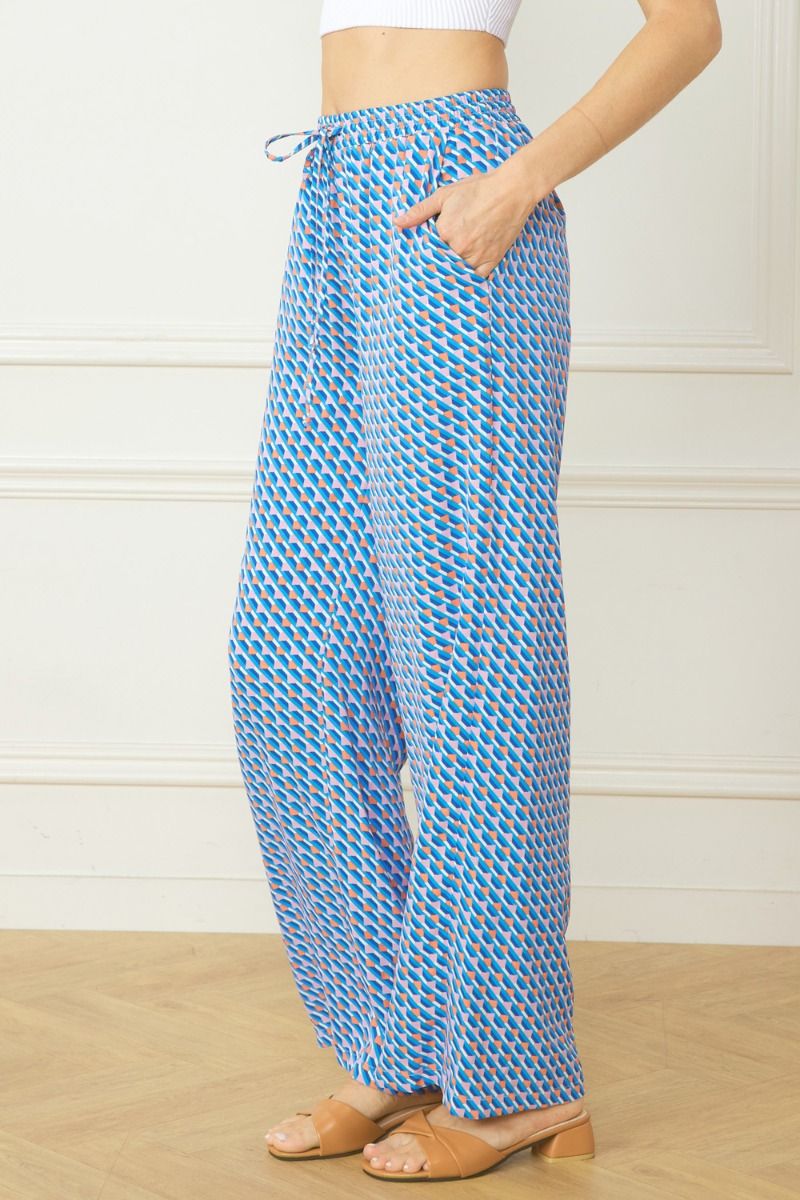 Print high-waisted wide leg pants featuring drawstring waist. Pockets at side. Unlined. Woven. Non-sheer. Lightweight.