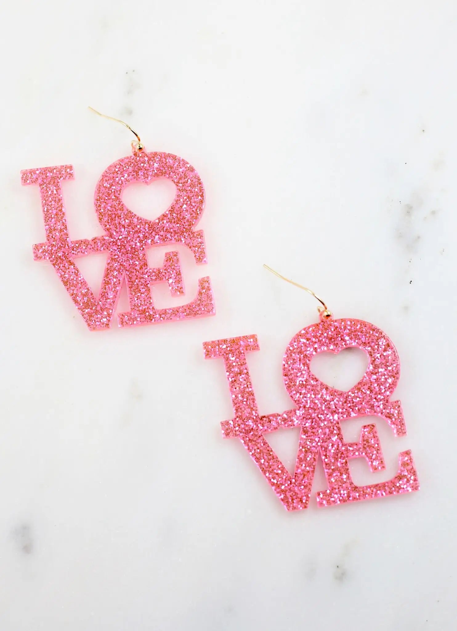 This glitter pink stacked Love earring has an open heart cutout on a fish hook back. It is lightweight and the perfect Valentine's Day accessory!