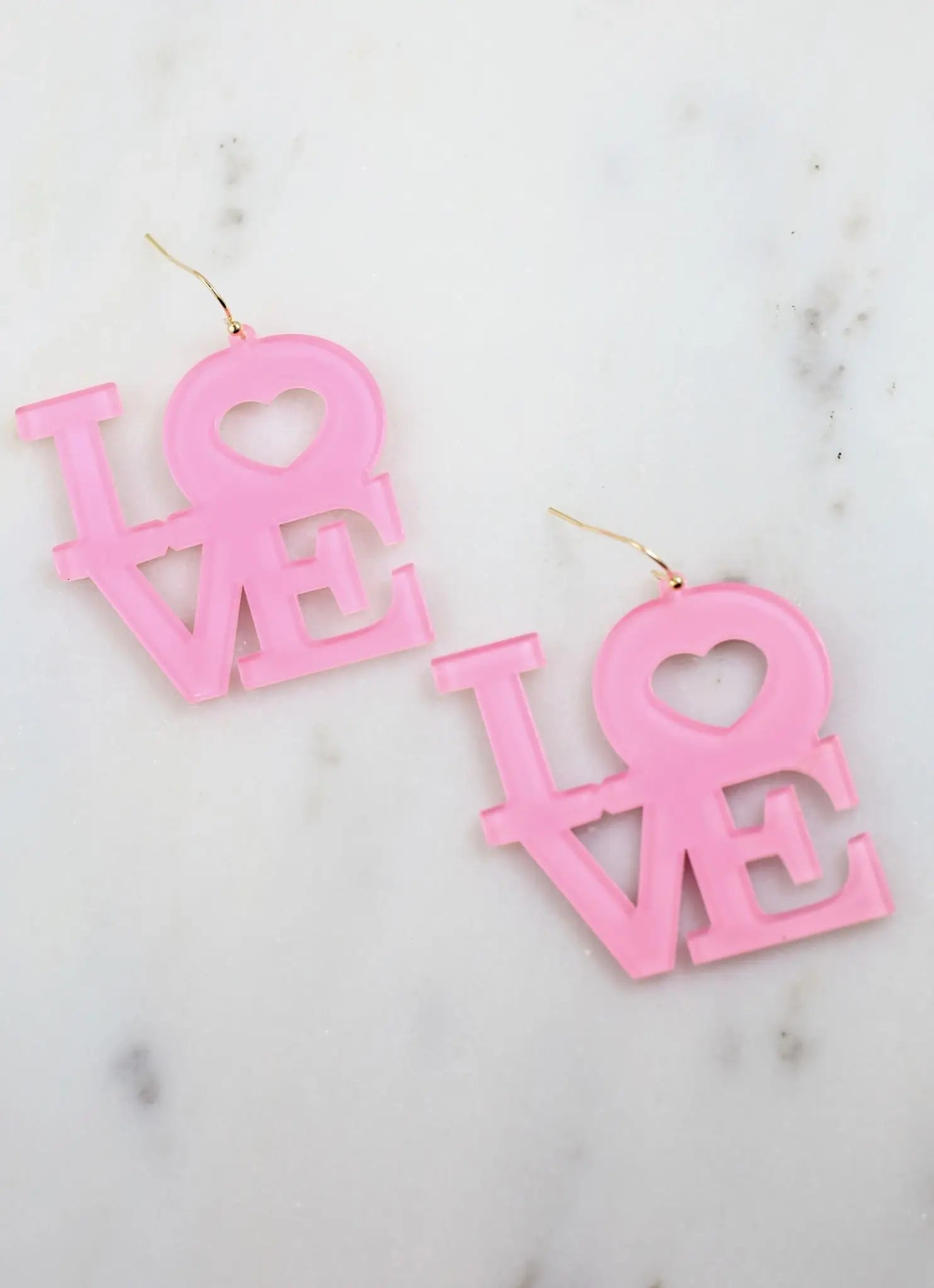 This pink stacked Love earring has an open heart cutout on a fish hook back. It is lightweight and the perfect Valentine's Day accessory!
