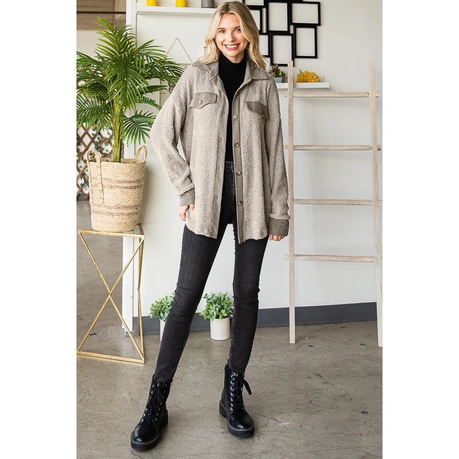 A soft solid shacket featuring a french terry contrast, collar neckline, button down, button detail, and long sleeves.