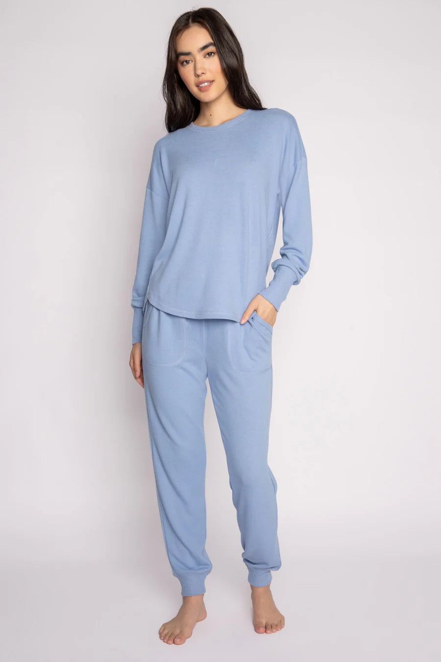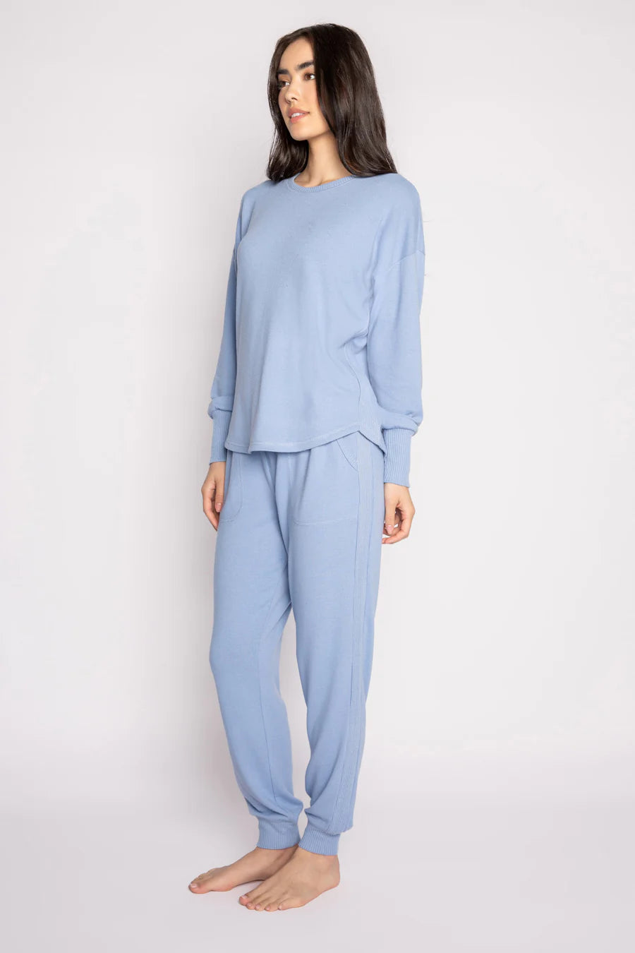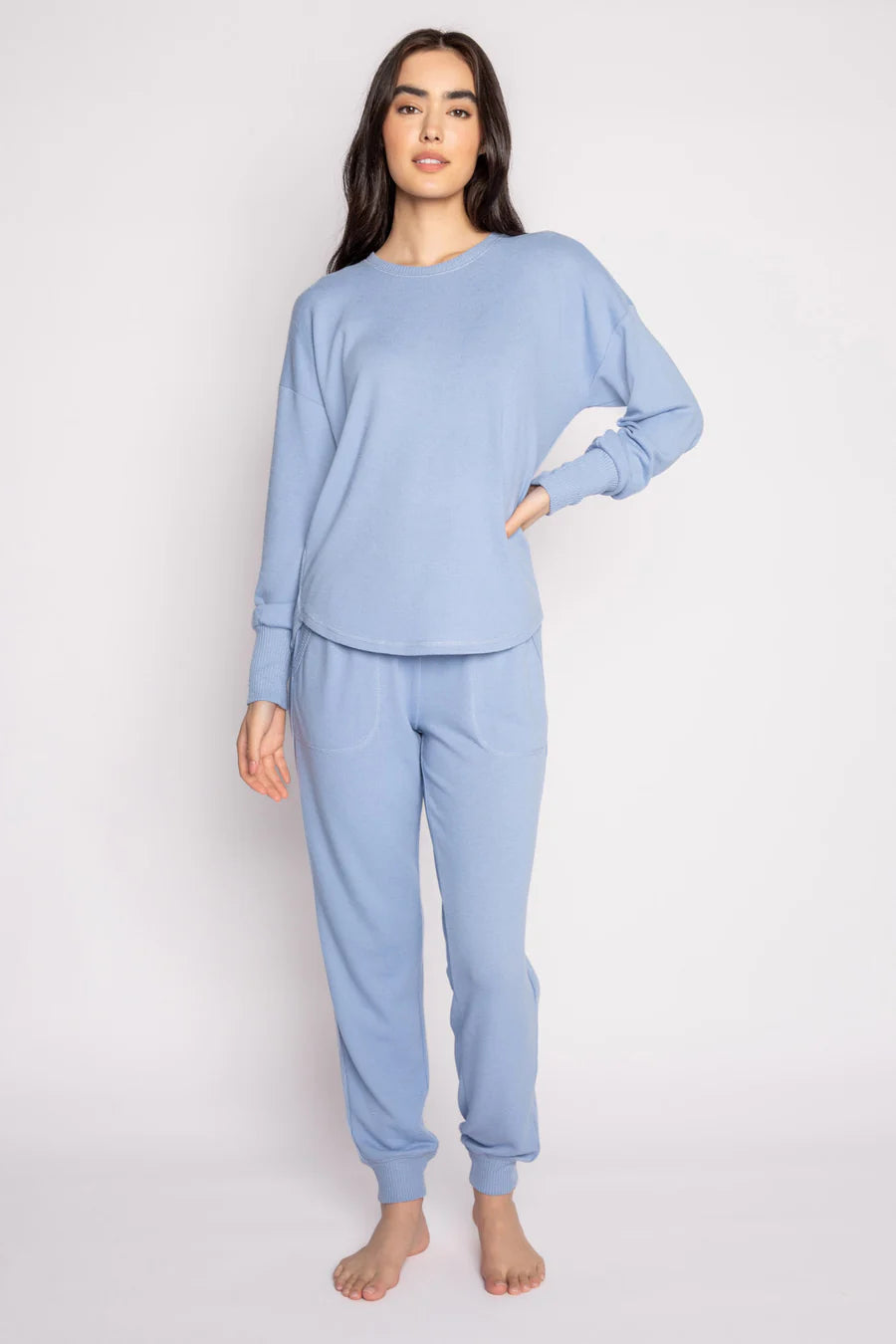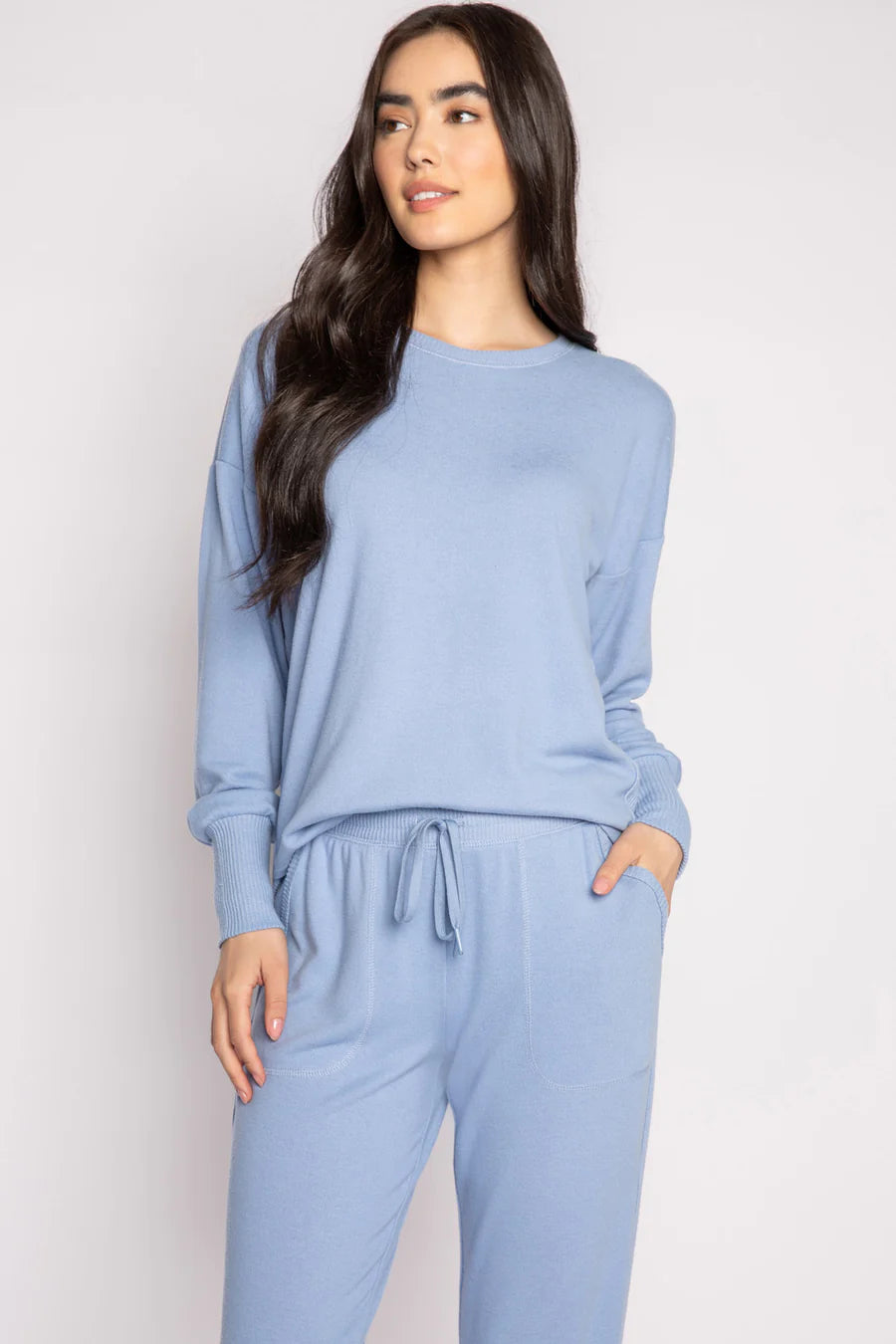 DESCRIPTION: The most versatile lounge set - pulled together enough to work as a light sweater outfit matched up, or mixed into your closet. Beautiful sky blue - the most flattering color on every body. Model is 5' 8 1/2", wearing size small.