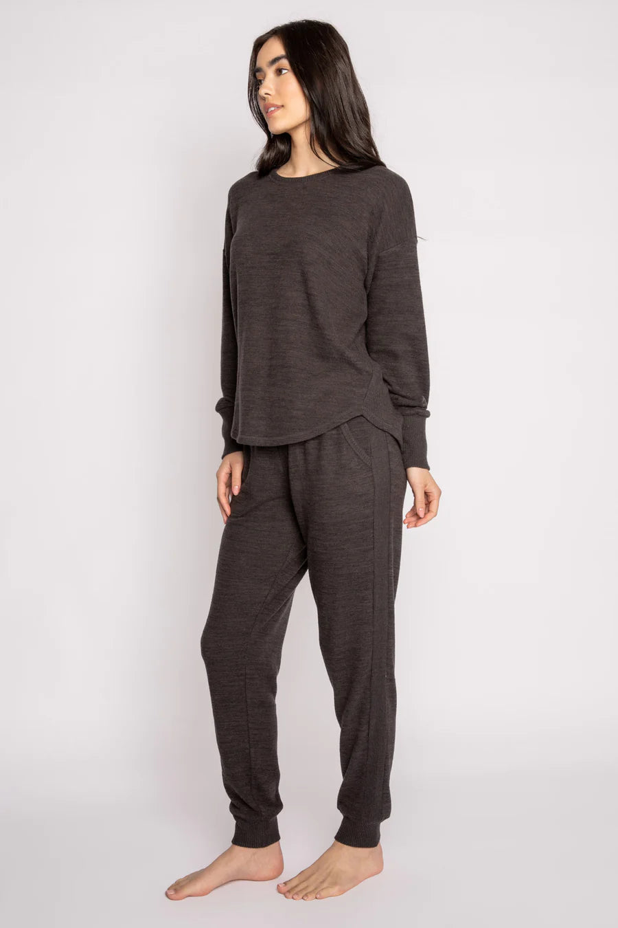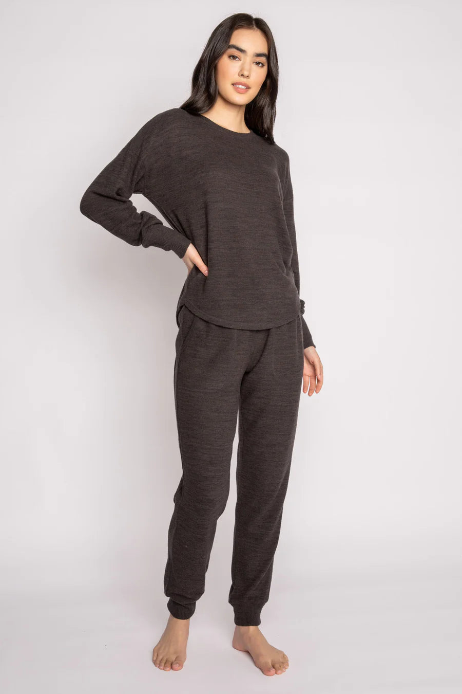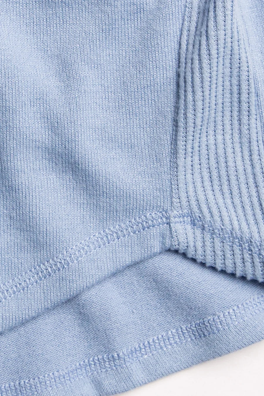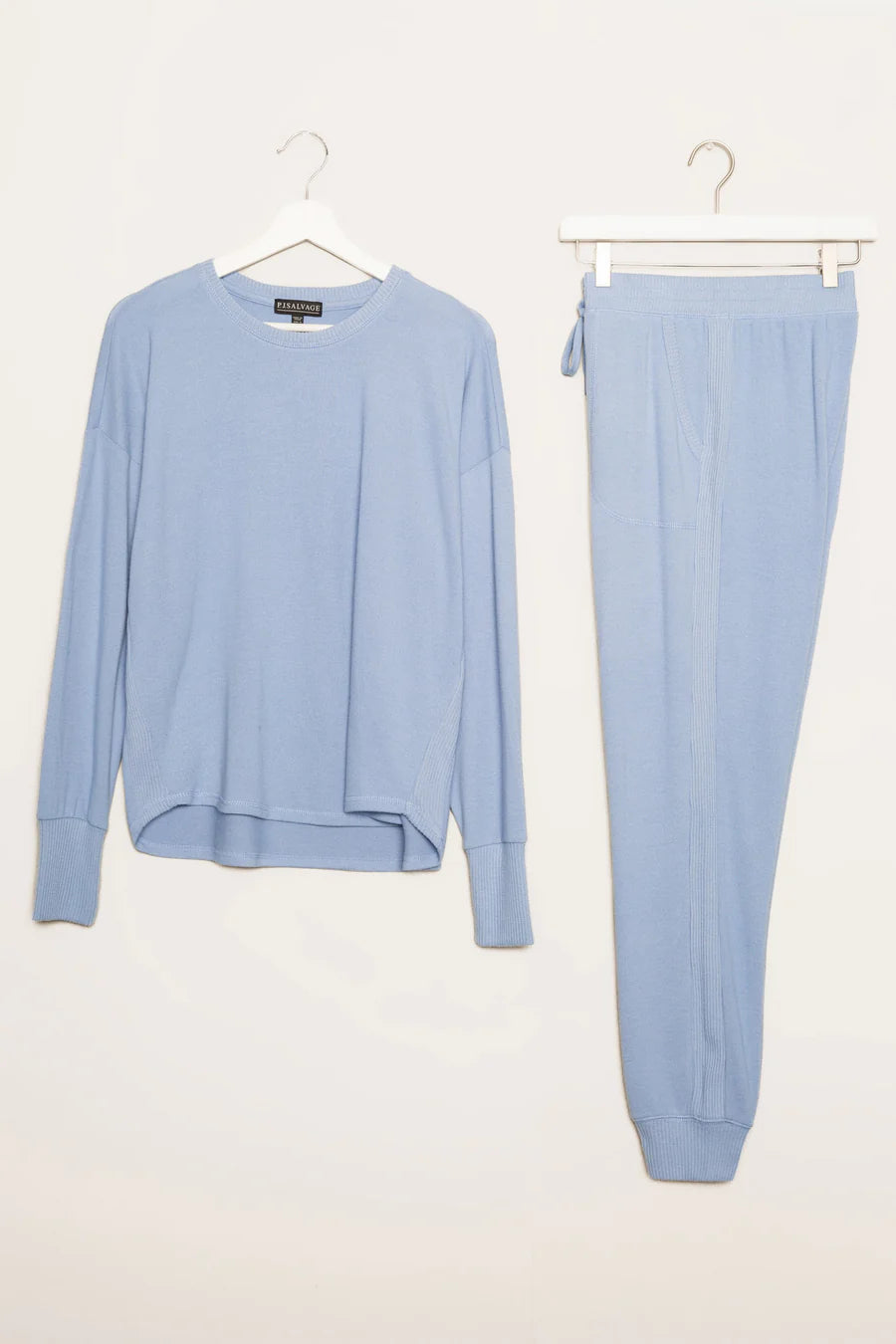 DESCRIPTION: The most versatile lounge set - pulled together enough to work as a light sweater outfit matched up, or mixed into your closet. Beautiful sky blue - the most flattering color on every body. Model is 5' 8 1/2", wearing size small.