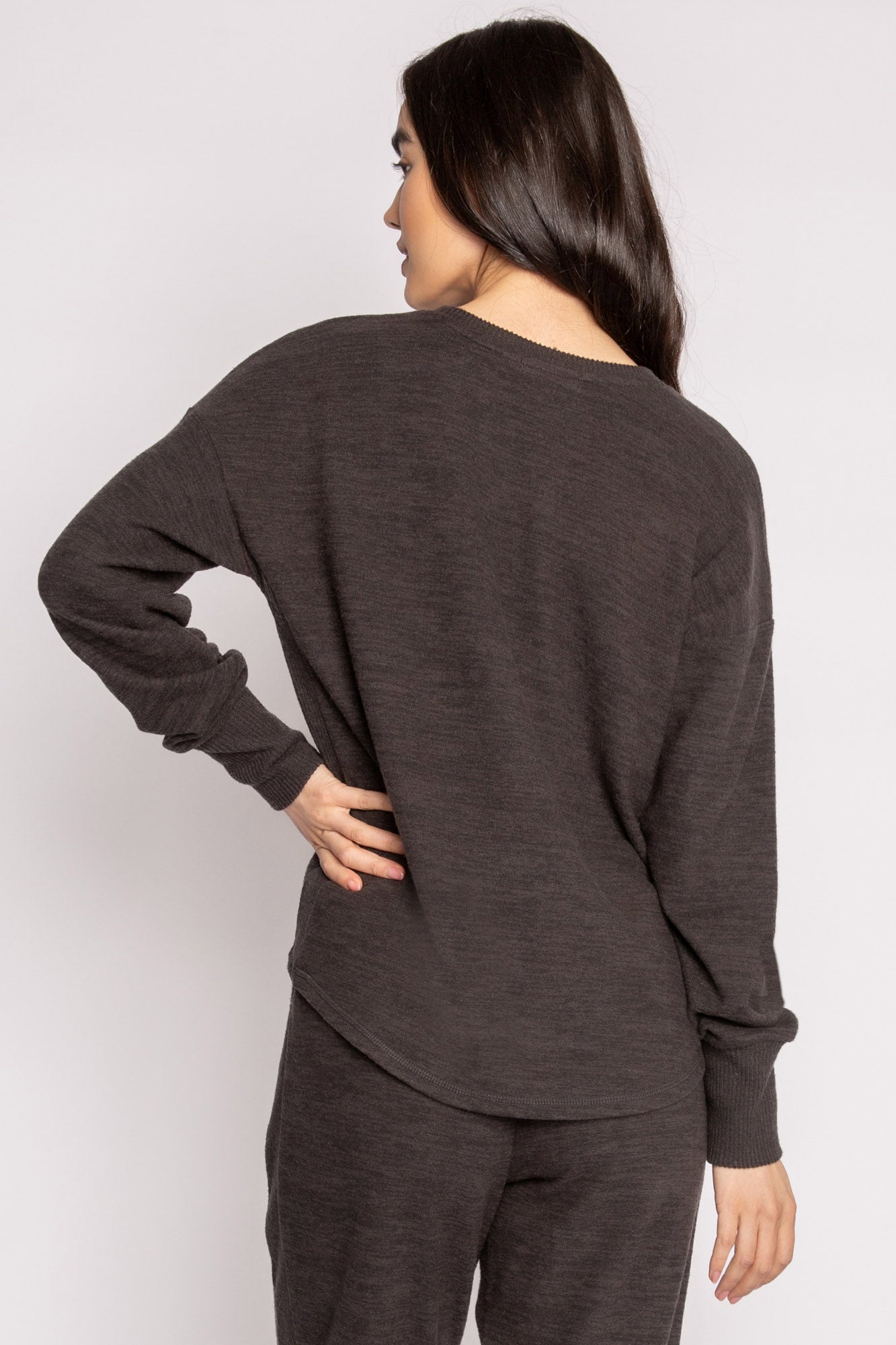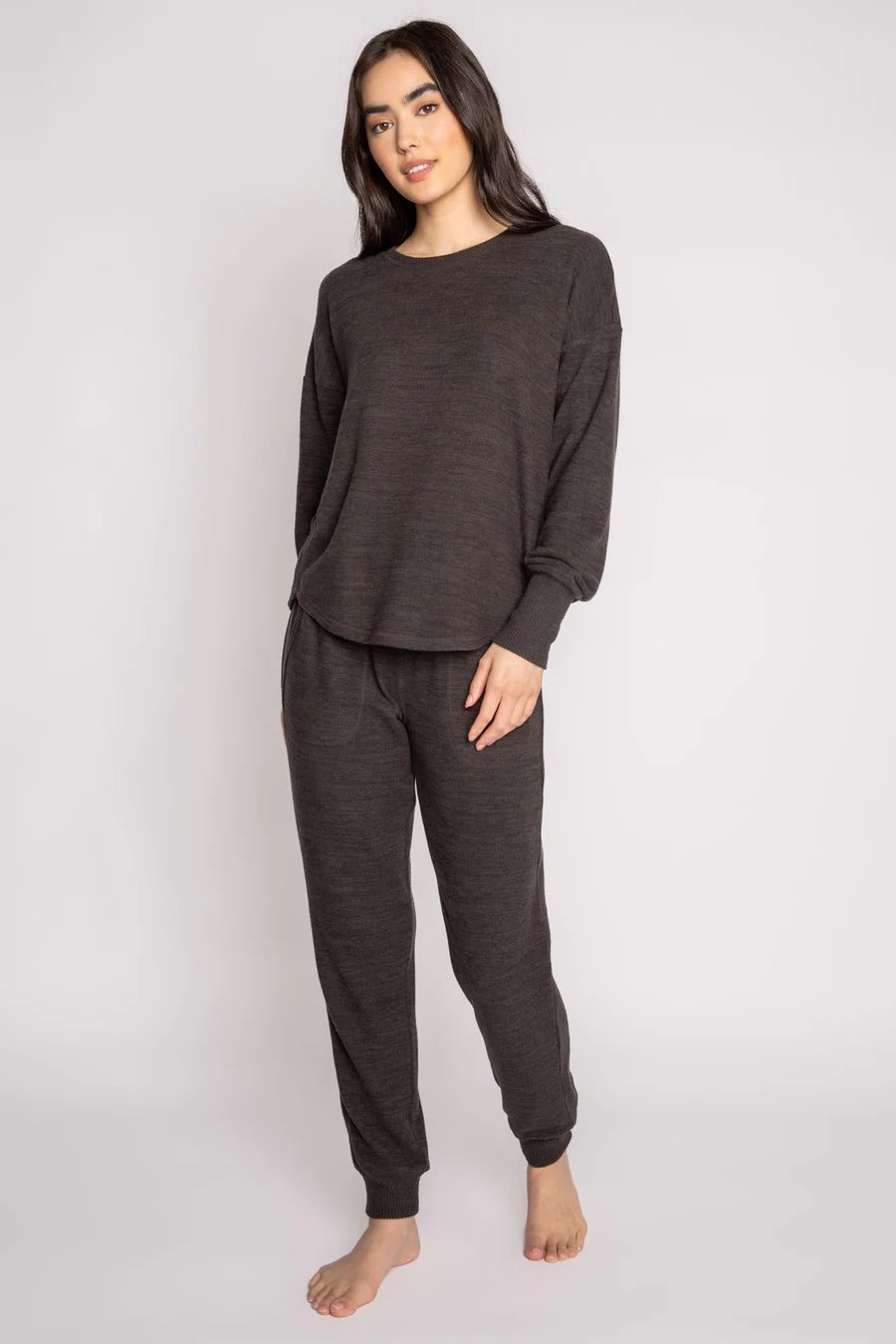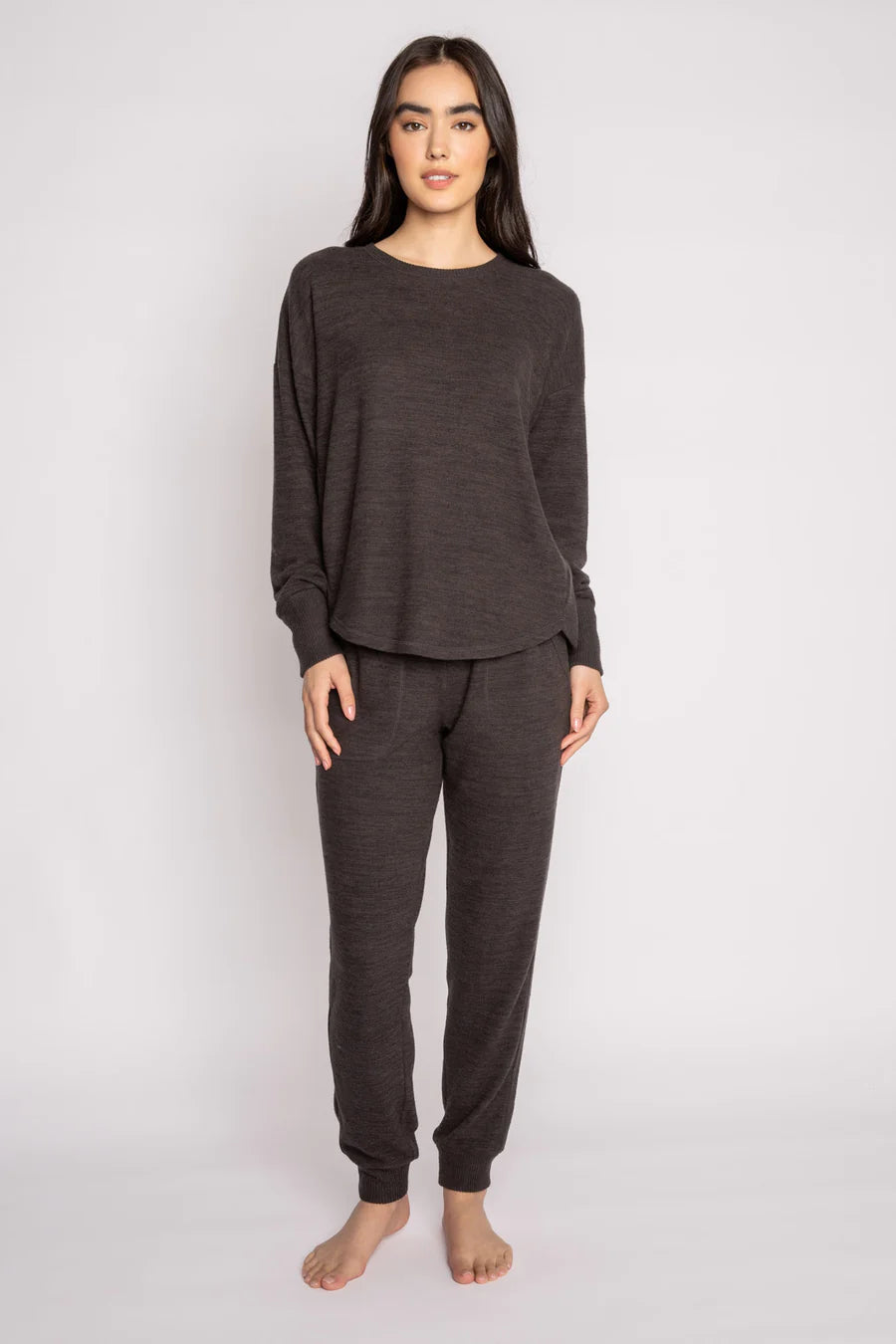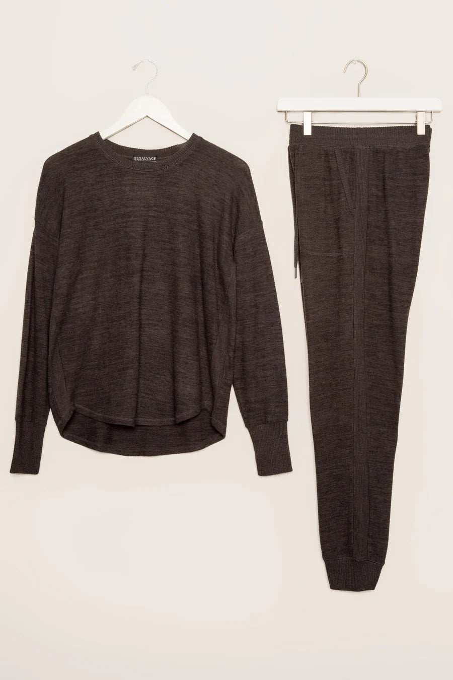 DESCRIPTION: The most versatile lounge set - pulled together enough to work as a light sweater outfit matched up, or mixed into your closet. Beautiful sky blue - the most flattering color on every body. Model is 5' 8 1/2", wearing size small.