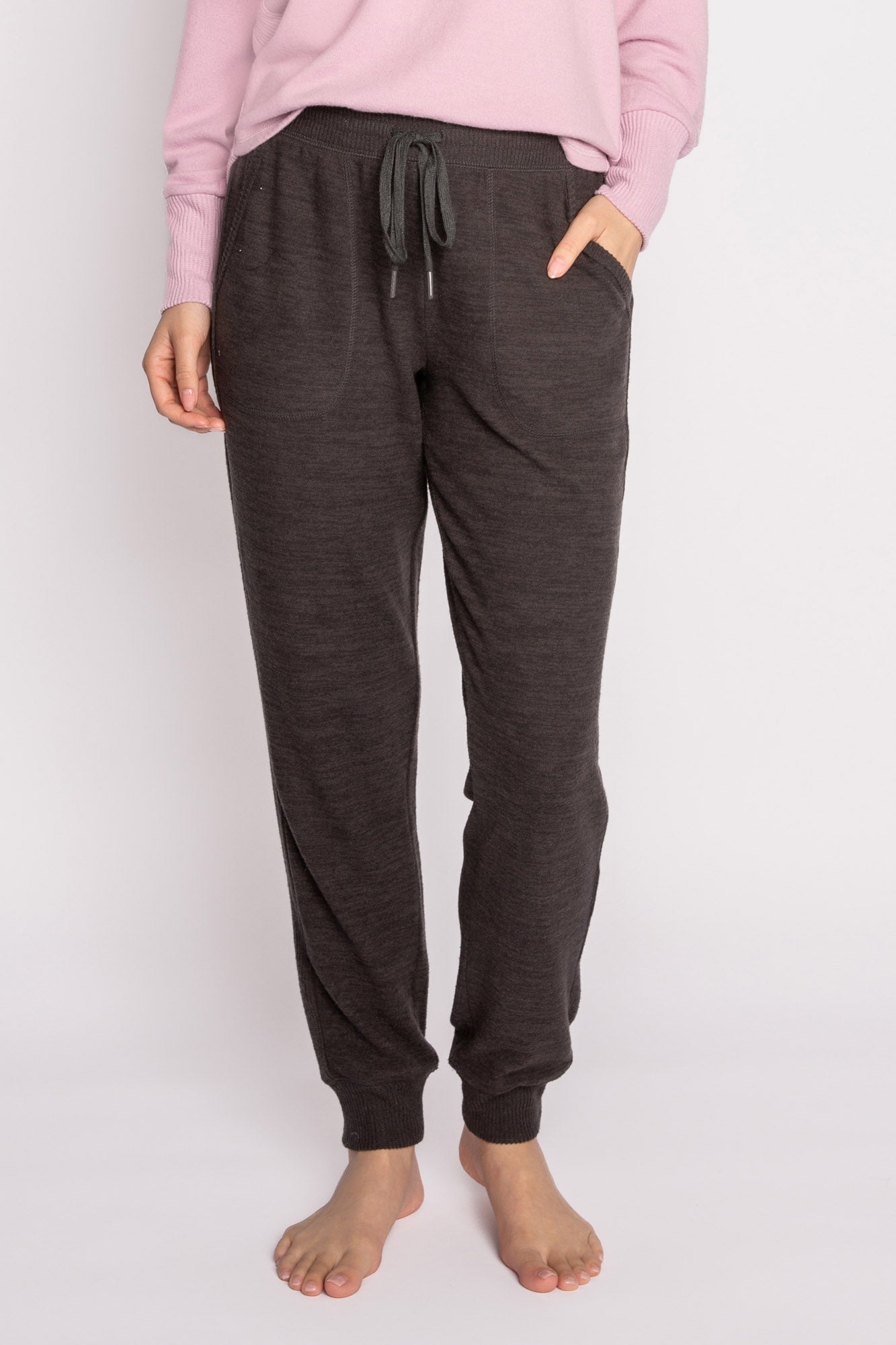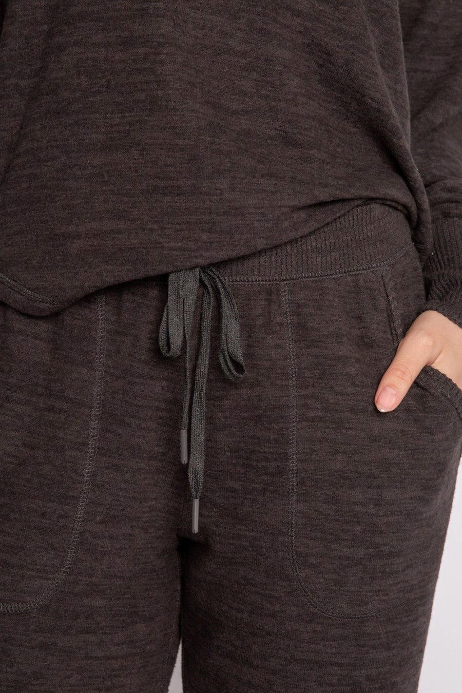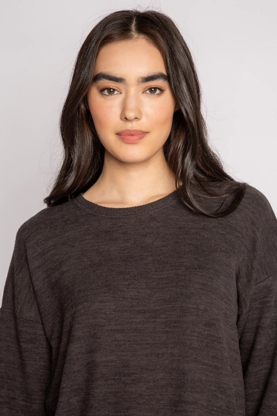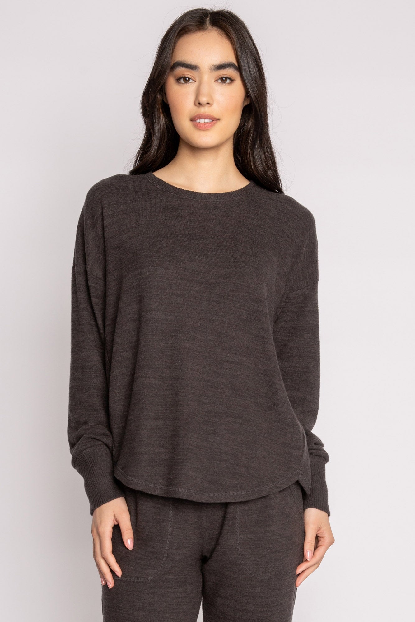 DESCRIPTION: The most versatile lounge set - pulled together enough to work as a light sweater outfit matched up, or mixed into your closet. Beautiful sky blue - the most flattering color on every body. Model is 5' 8 1/2", wearing size small.