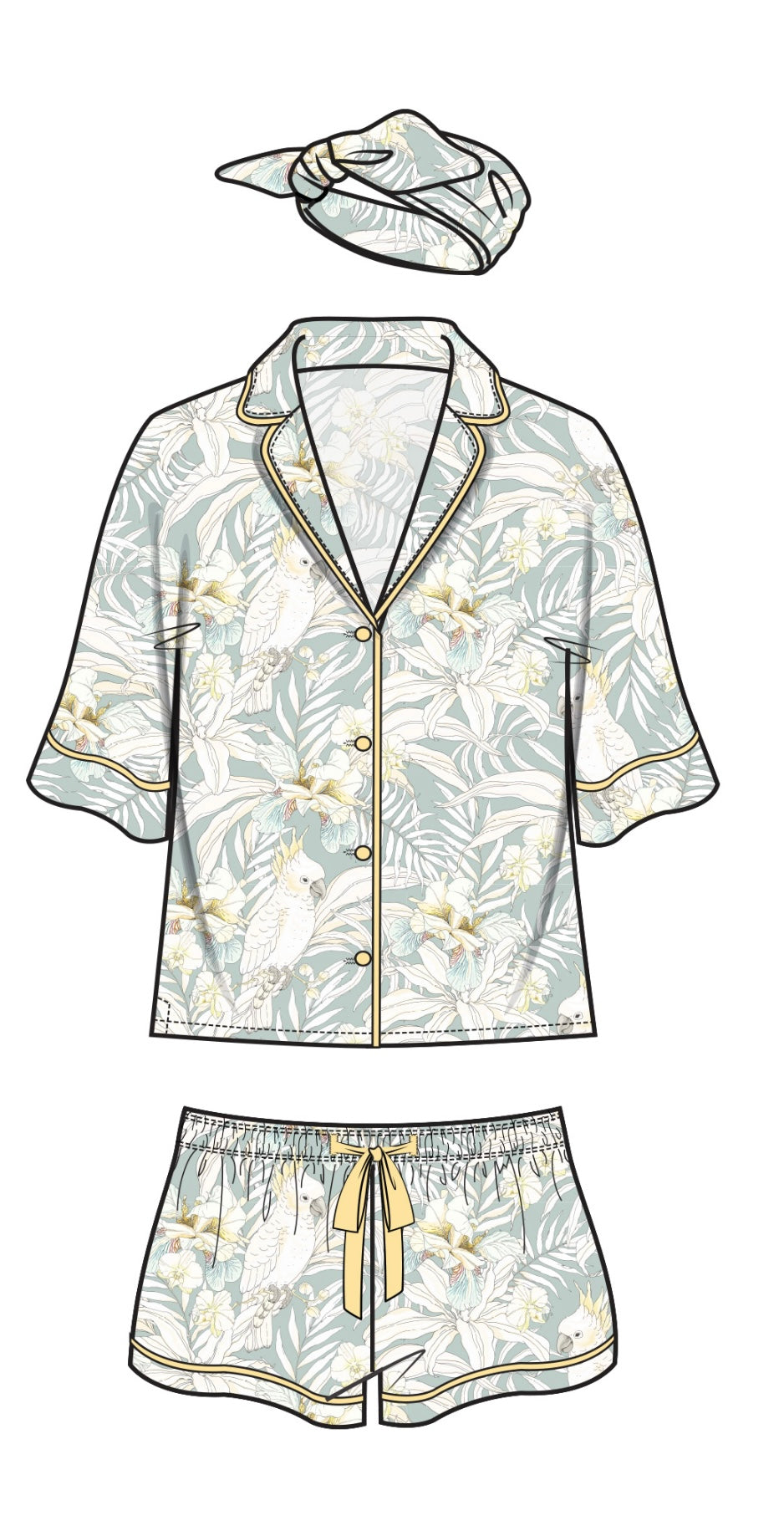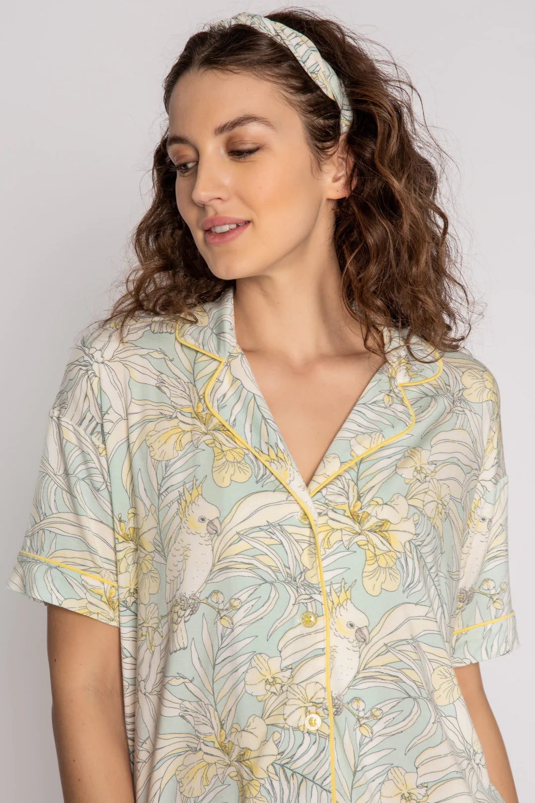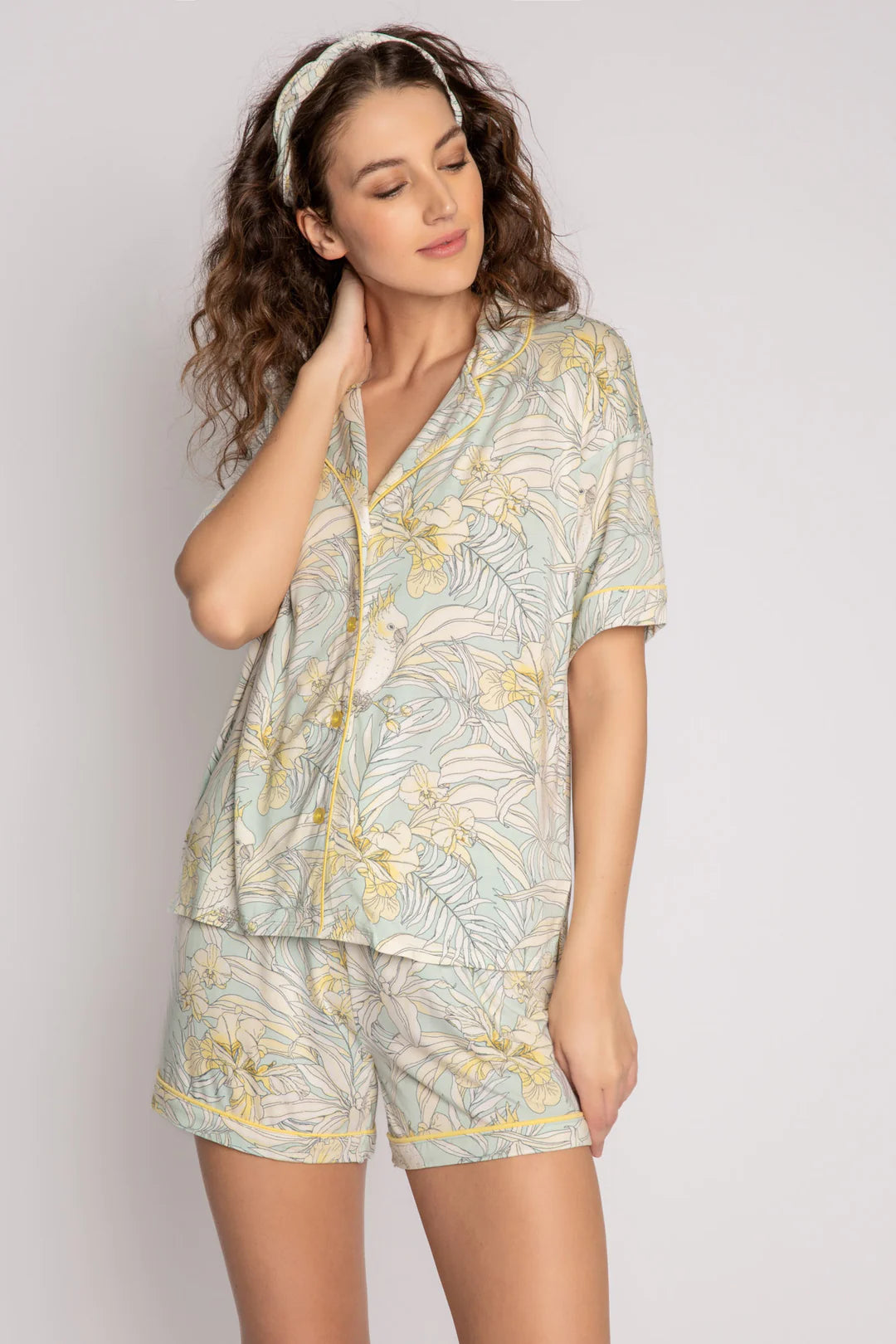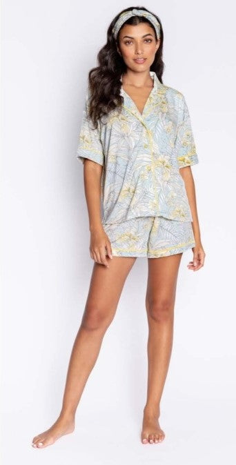 DESCRIPTION: Lead your flock straight to bed. A perfectly comfy pajama short set with classic button-up top. Includes a matching hair wrap for your bedtime routine. Sleep tight in a pj in luxe, drapey modal jersey. Model is 5' 8 1/2" wearing size small.