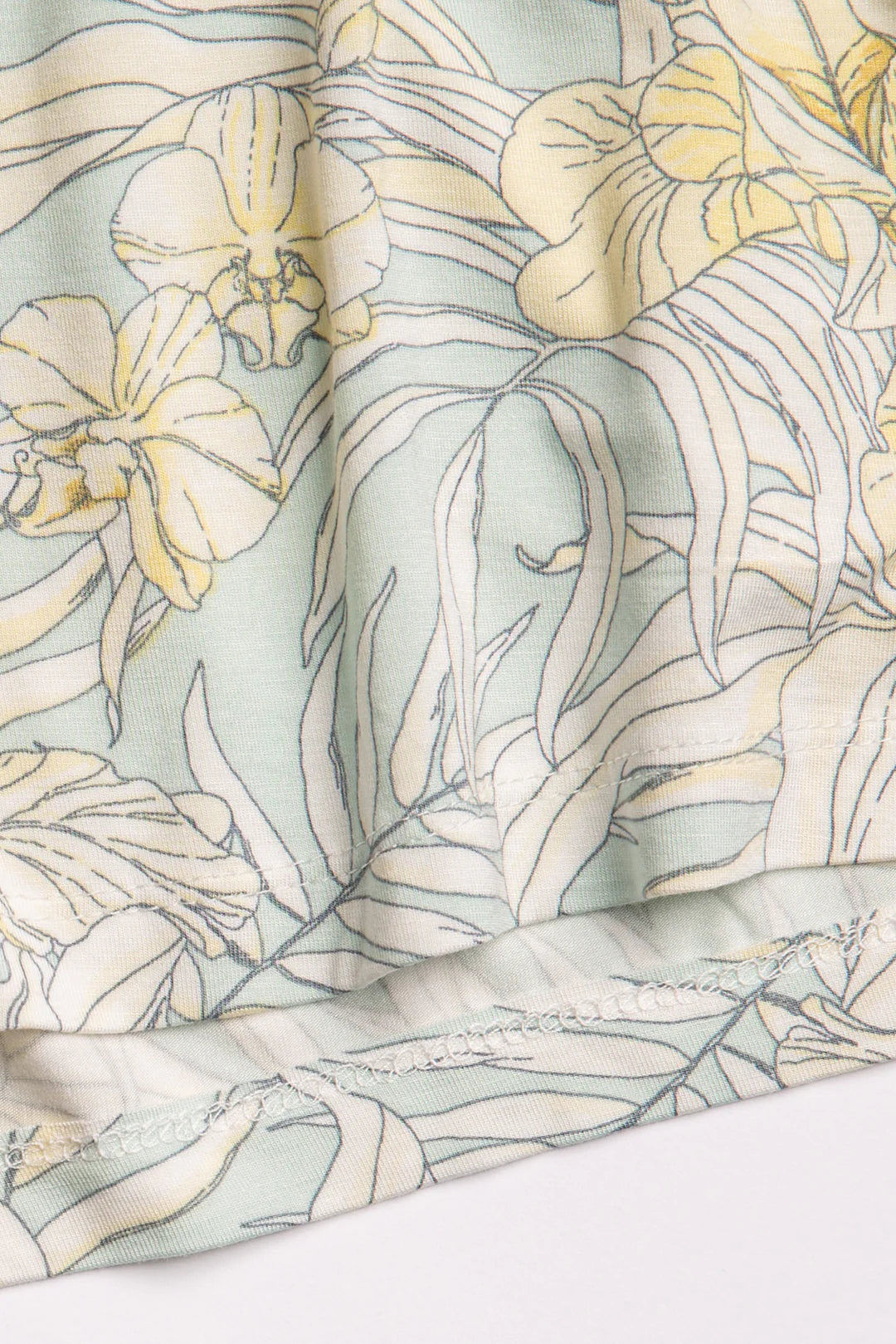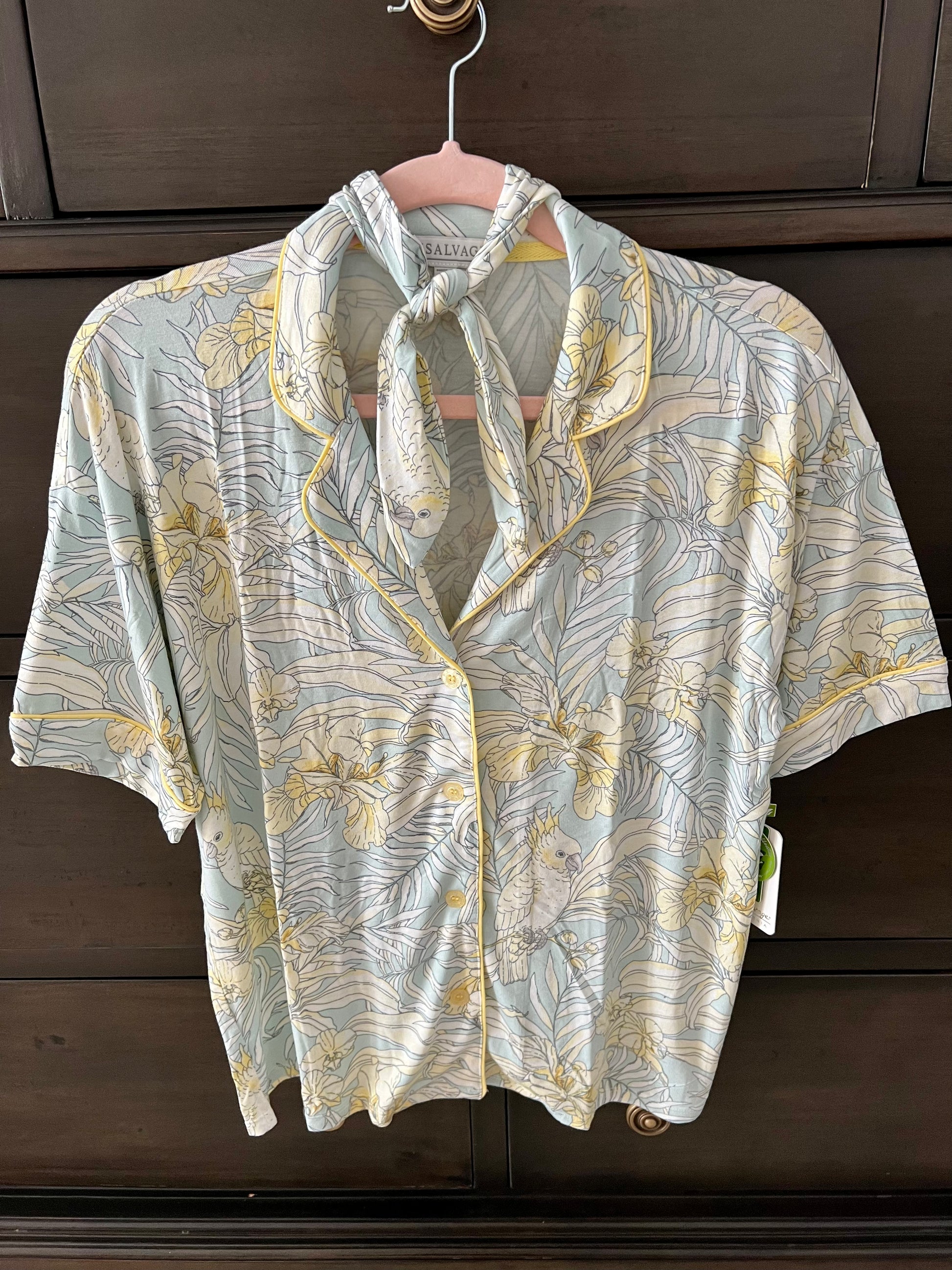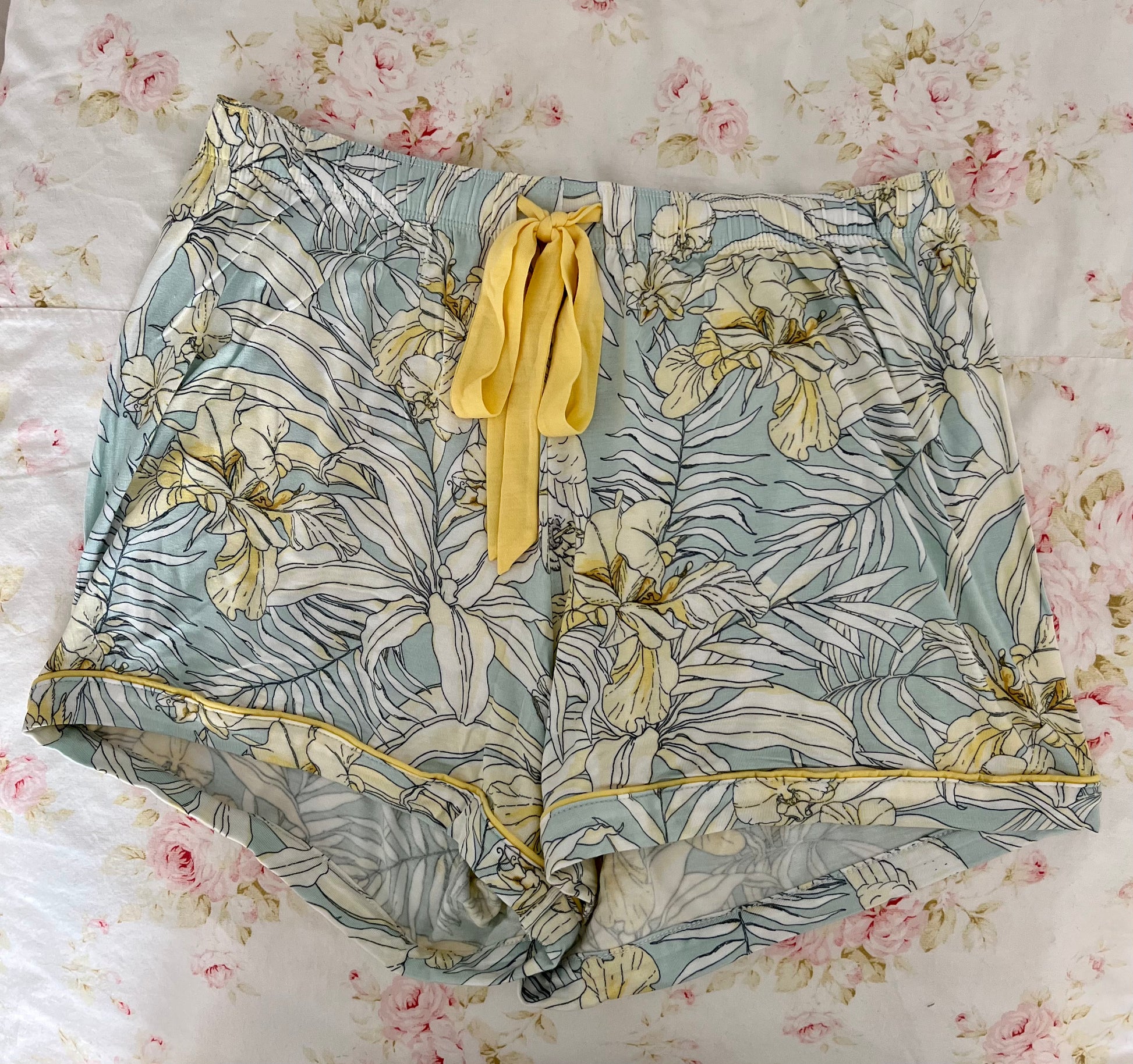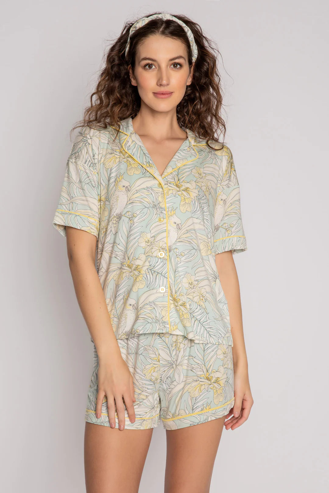 DESCRIPTION: Lead your flock straight to bed. A perfectly comfy pajama short set with classic button-up top. Includes a matching hair wrap for your bedtime routine. Sleep tight in a pj in luxe, drapey modal jersey. Model is 5' 8 1/2" wearing size small.