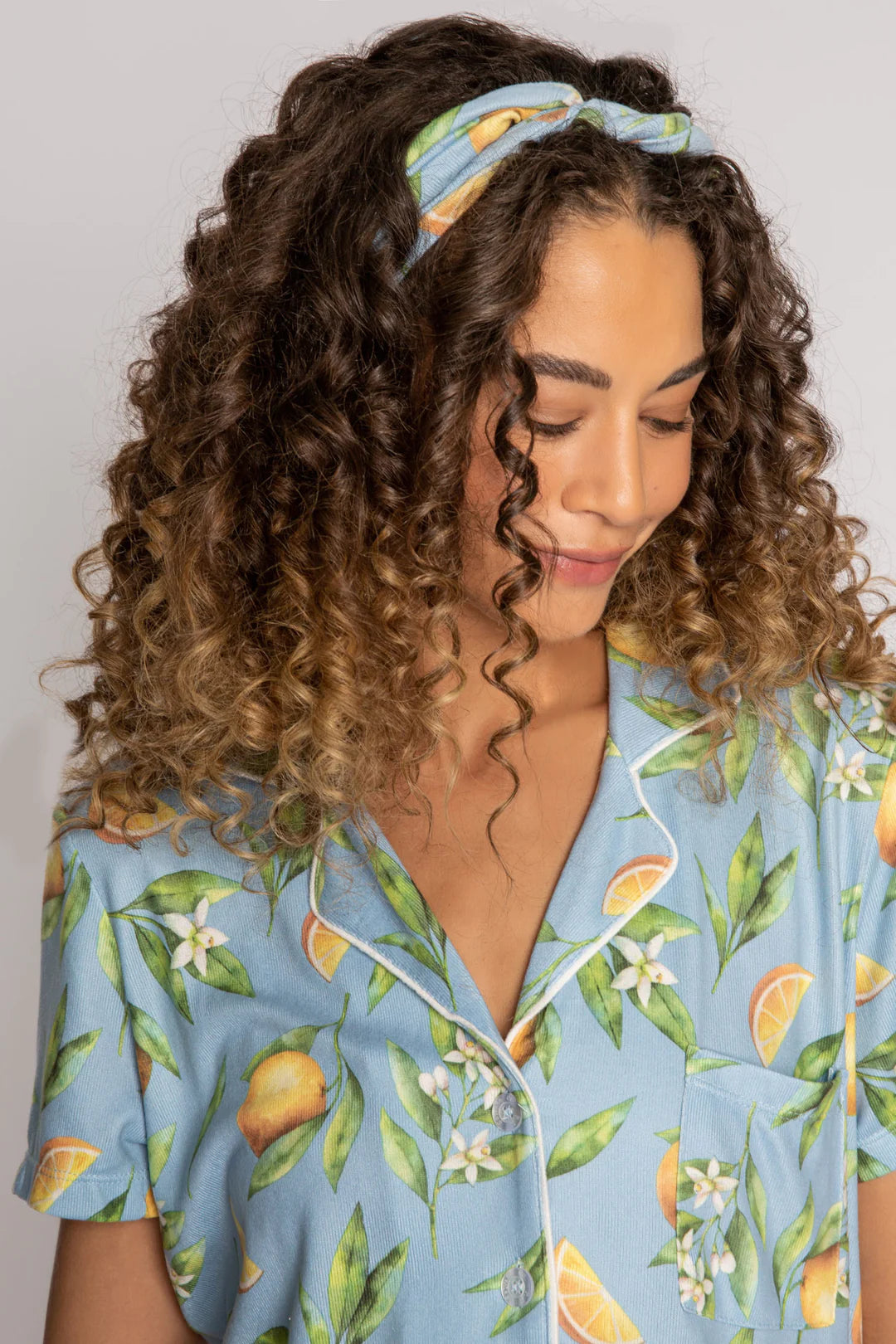 DESCRIPTION: Freshly squeezed - the pajama short set just for you. The freshest statement print in a button-front pj top & tie-waist sleep short. Model is 5" 9", wearing size small.