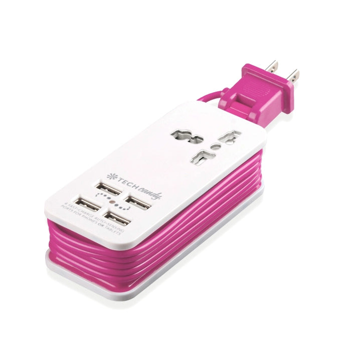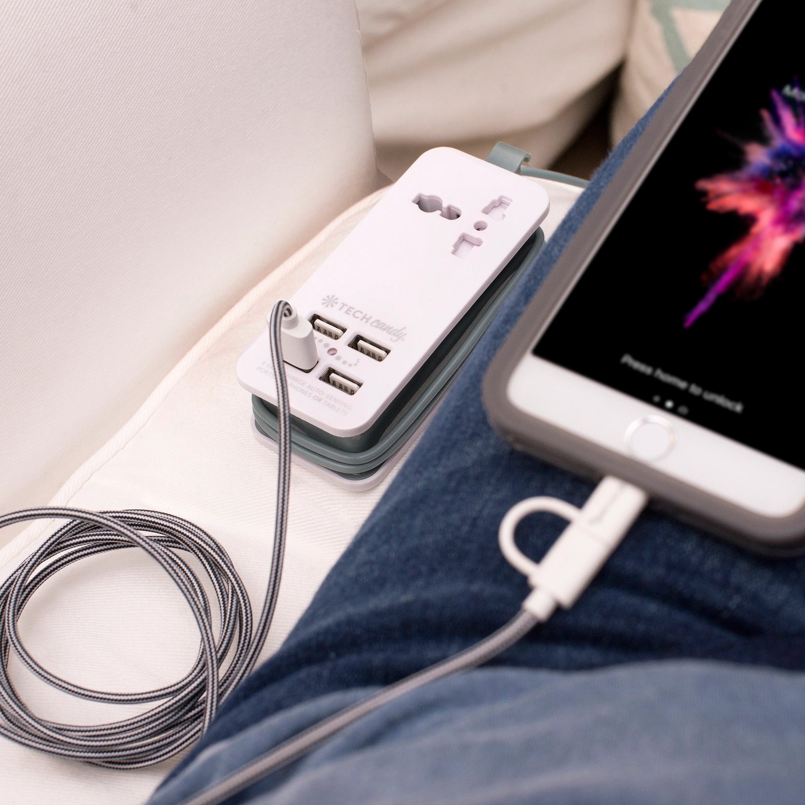An outlet & 4 USB ports are nestled in 1 compact travel charging station, a co-pilot to charge every mobile device. 4 USB 2.0 Smart Chip ports & 1 copper 3-prong outlet are strong enough to handle 5 devices at once. When you plug into the USB port, the POWER TRIP senses your device & delivers the right amount of power, charging as fast as possible. OVP assures a stable current to your gadgets. 5’ long cord winds neatly when not in use, keeping your bag tidy // MADE OF: ABS + Electronic Comp.