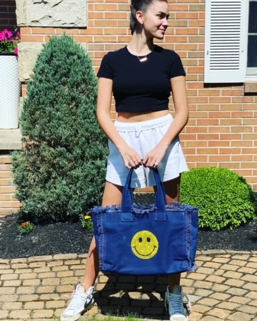 Reagan Sailcloth Tote in Navy Blue with Rhinestone Smile