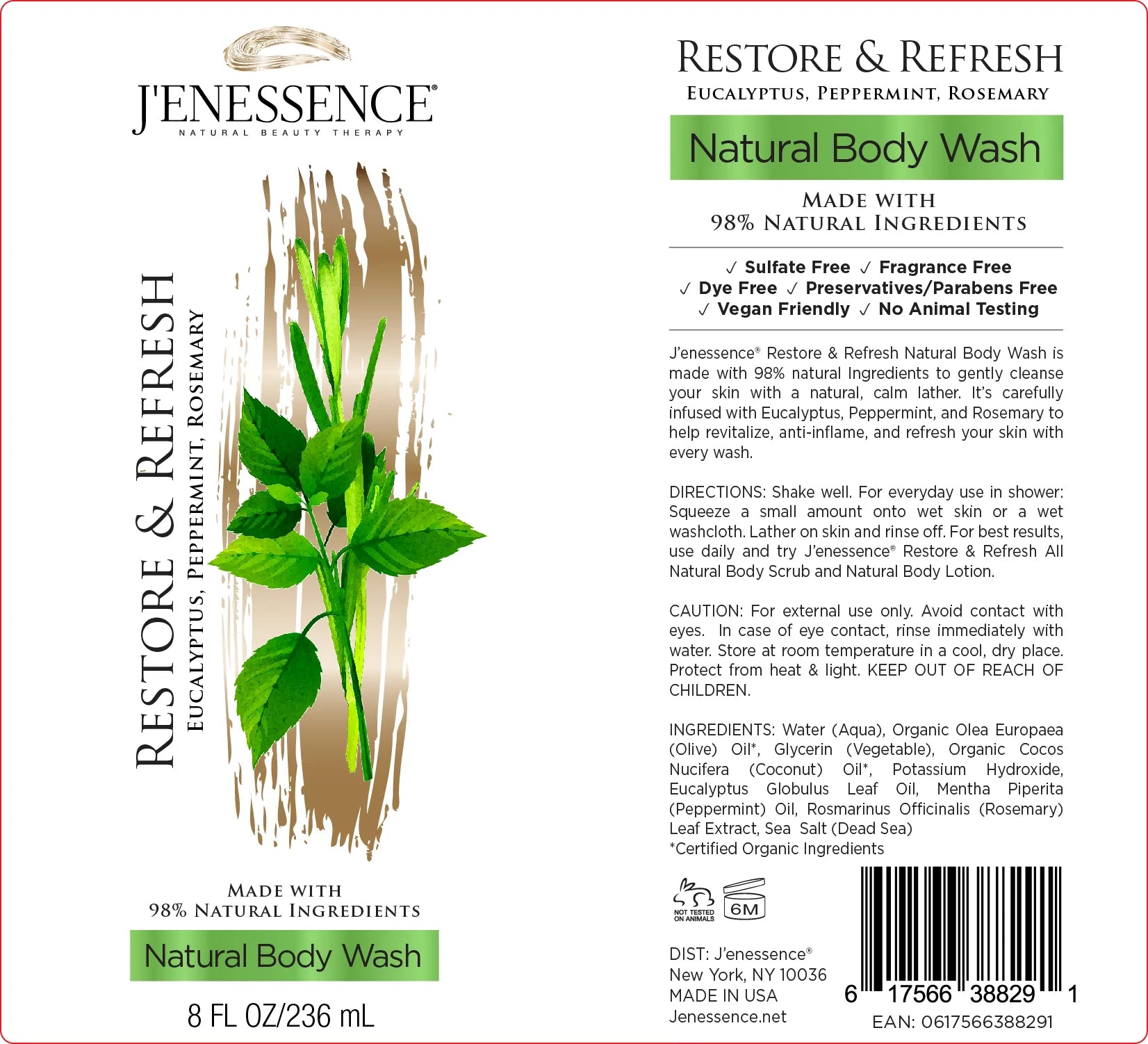 J’enessence® Restore & Refresh Natural Body Wash is made with 98% natural ingredients to gently cleanse your skin with a natural, calm lather. It’s carefully infused with Eucalyptus, Peppermint, and Rosemary to help revitalize, anti-inflame, and refresh your skin with every wash.