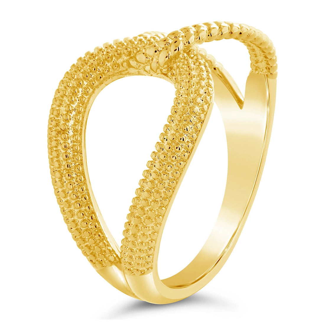 Take your look to the next level when you wear this looped, textured ring! This unique design is sure to get your compliments everywhere you go. Available in gold and silver tones.