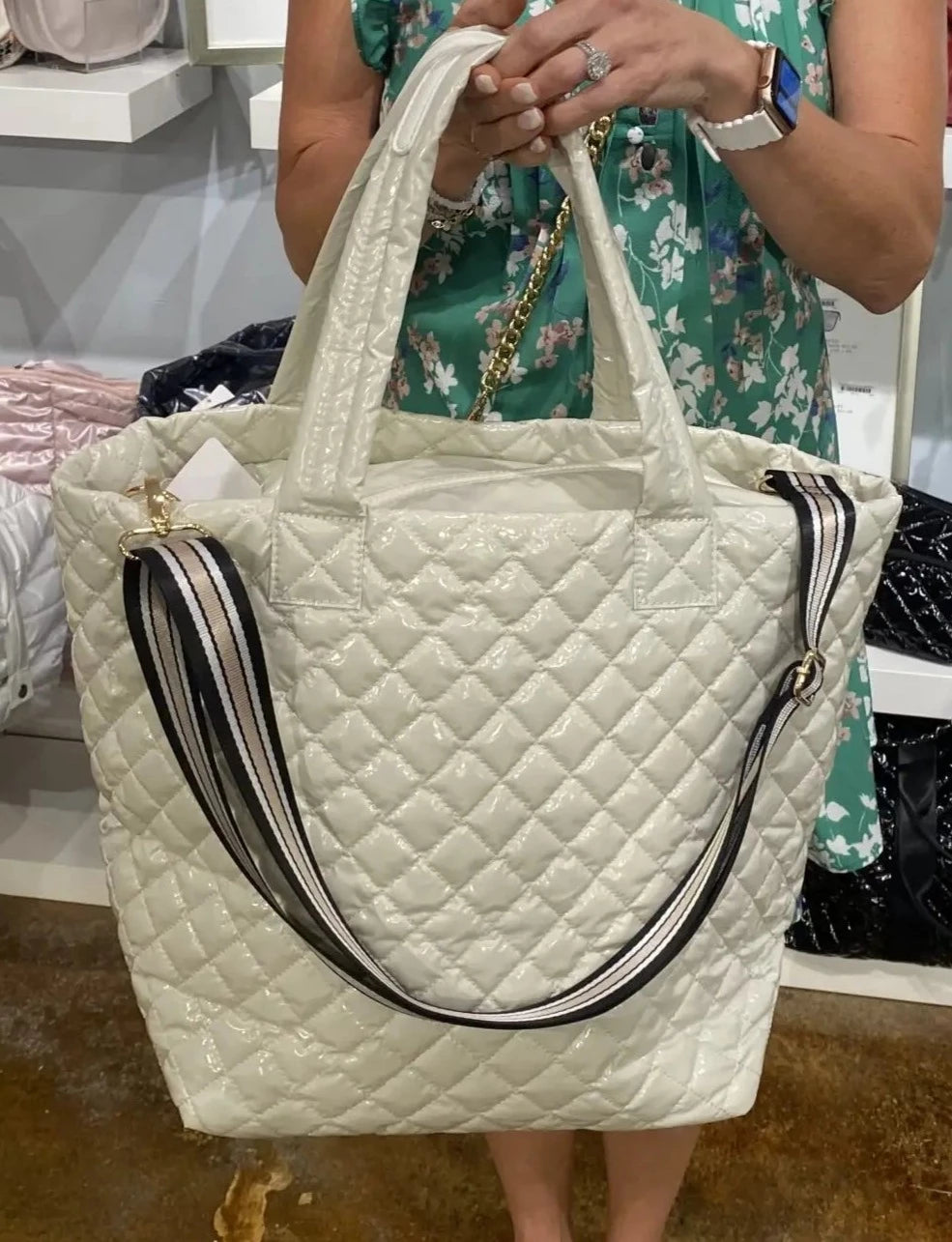Our newest addition, the diamond puffer collection is on trend with its patent lacquer finish in four beautiful color. The traditional Black Patent, the Gunmetal Patent, the Gold Metallic Patent and the Almond Patent. Great for everyday or on the go! Comes with detachable striped strap for easy carrying over the shoulder or crossbody.