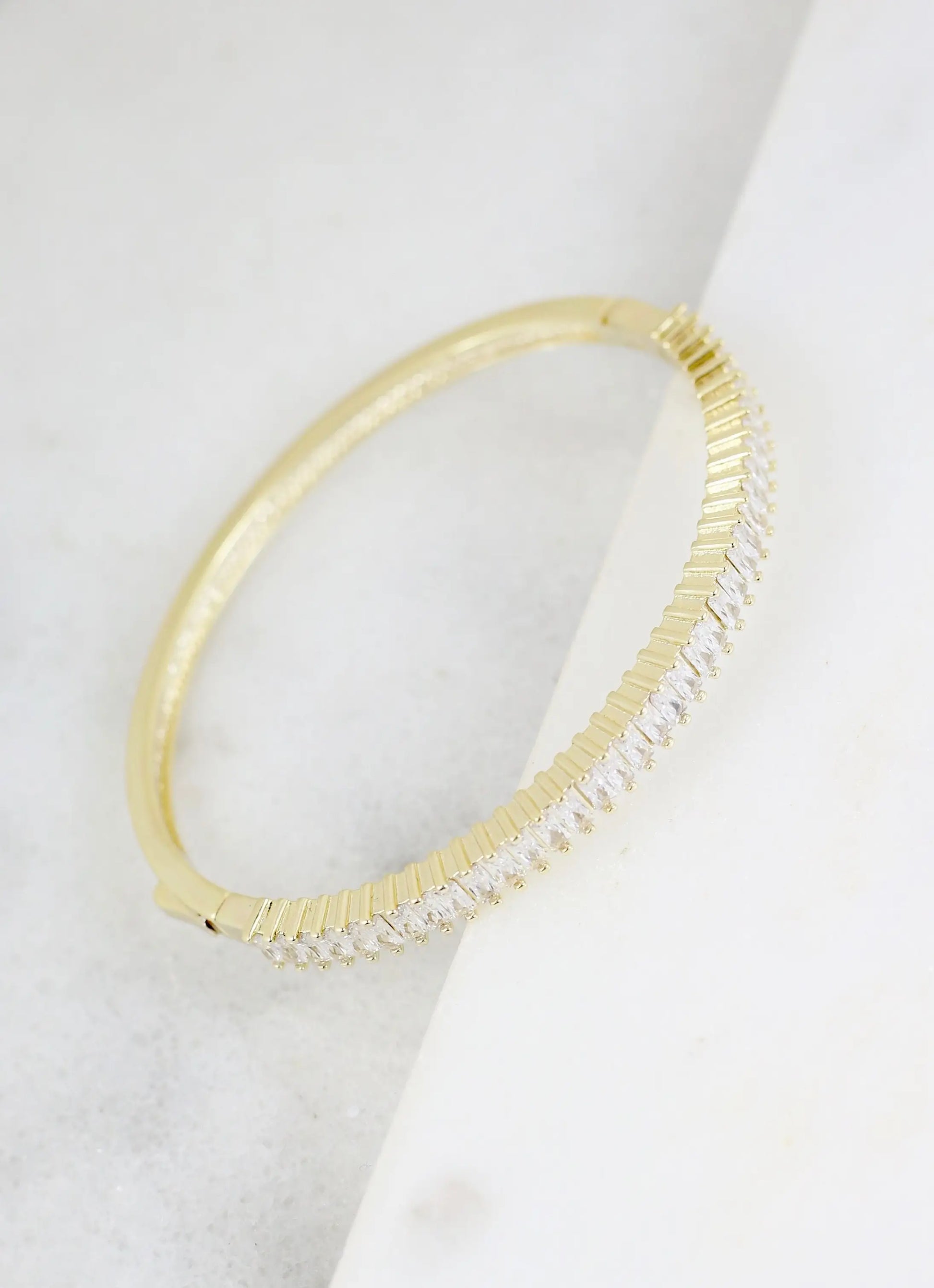 This shiny gold bangle features baguette style stones and a side hinge closure.