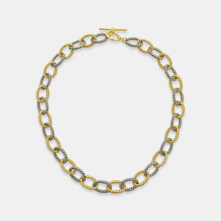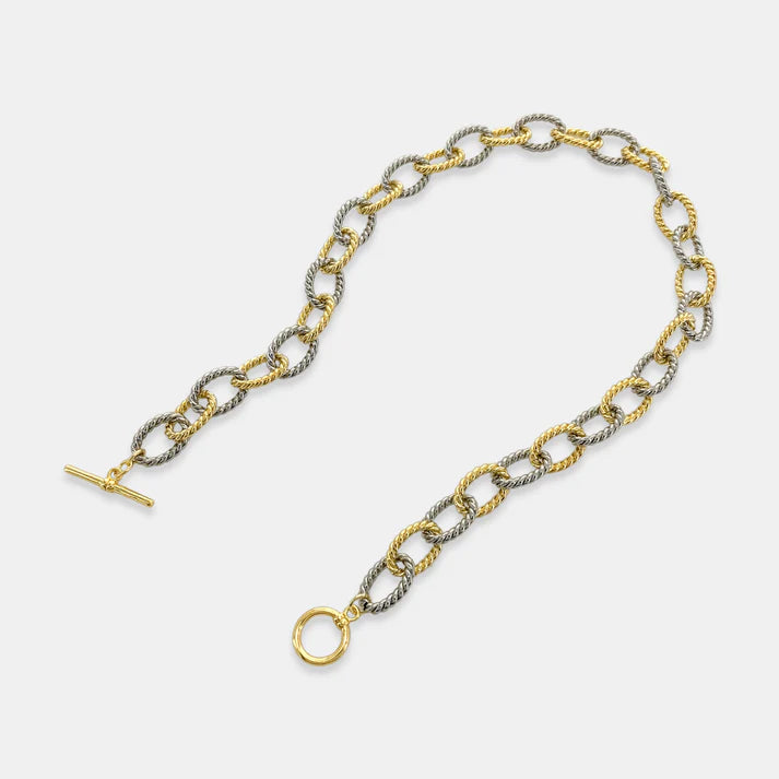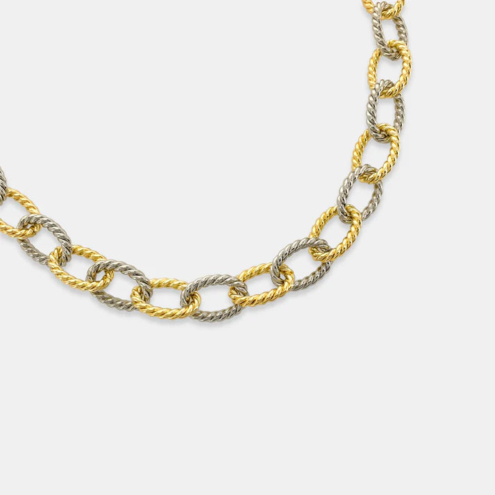 Two tone rope chain necklace with gold and rhodium plated twisted rope chain links, complete with a toggle closure.