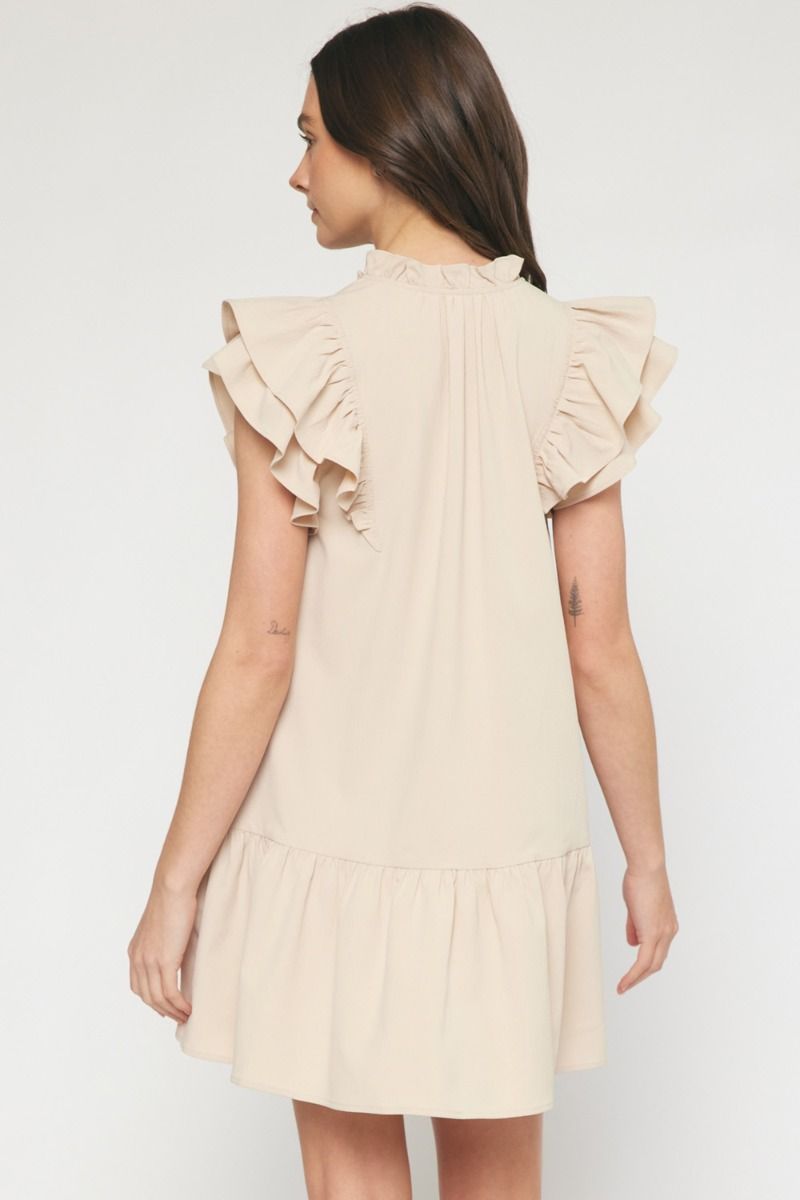 V-neck ruffle sleeve tiered mini dress featuring self tie closure at front neck. Pockets at side. Lined. Woven. Non-sheer. Lightweight.