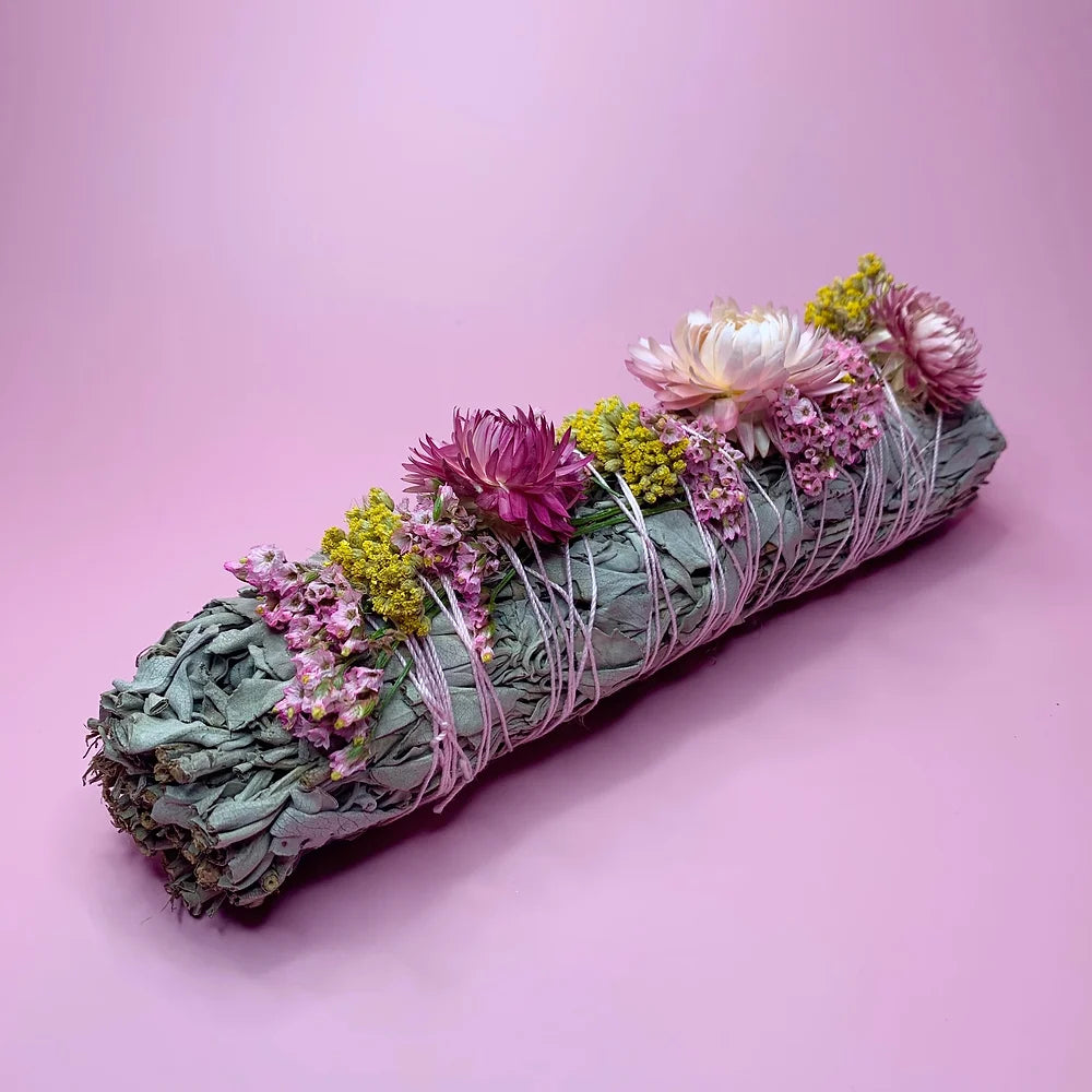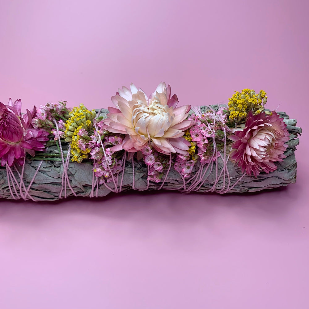 This beautiful sage stick is hand wrapped in yellow roses, pink limonium, statice and yellow straw flowers! Measuring 9” long, this stick is sure to cleanse your space and bring in some sunshine ☀️